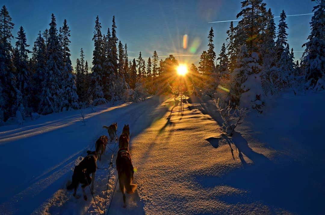 Wenn die Sonne untergeht, verwandelt sich die Wald- und Berglandschaft rund um Kopperå in ein magisches Winterwunderland, das Ihr beim Hundeschlittenfahren bei Trondheim entdecken könnt. Lasst Euch von unseren starken Alaska-Huskys durch die Dunkelheit führen, die nur vom Mond und Euren Stirnlampen erhellt wird. Wenn Ihr Glück habt, könnt Ihr sogar einen Blick auf die atemberaubenden Nordlichter erhaschen oder einen atemberaubenden Sonnenuntergang erleben.