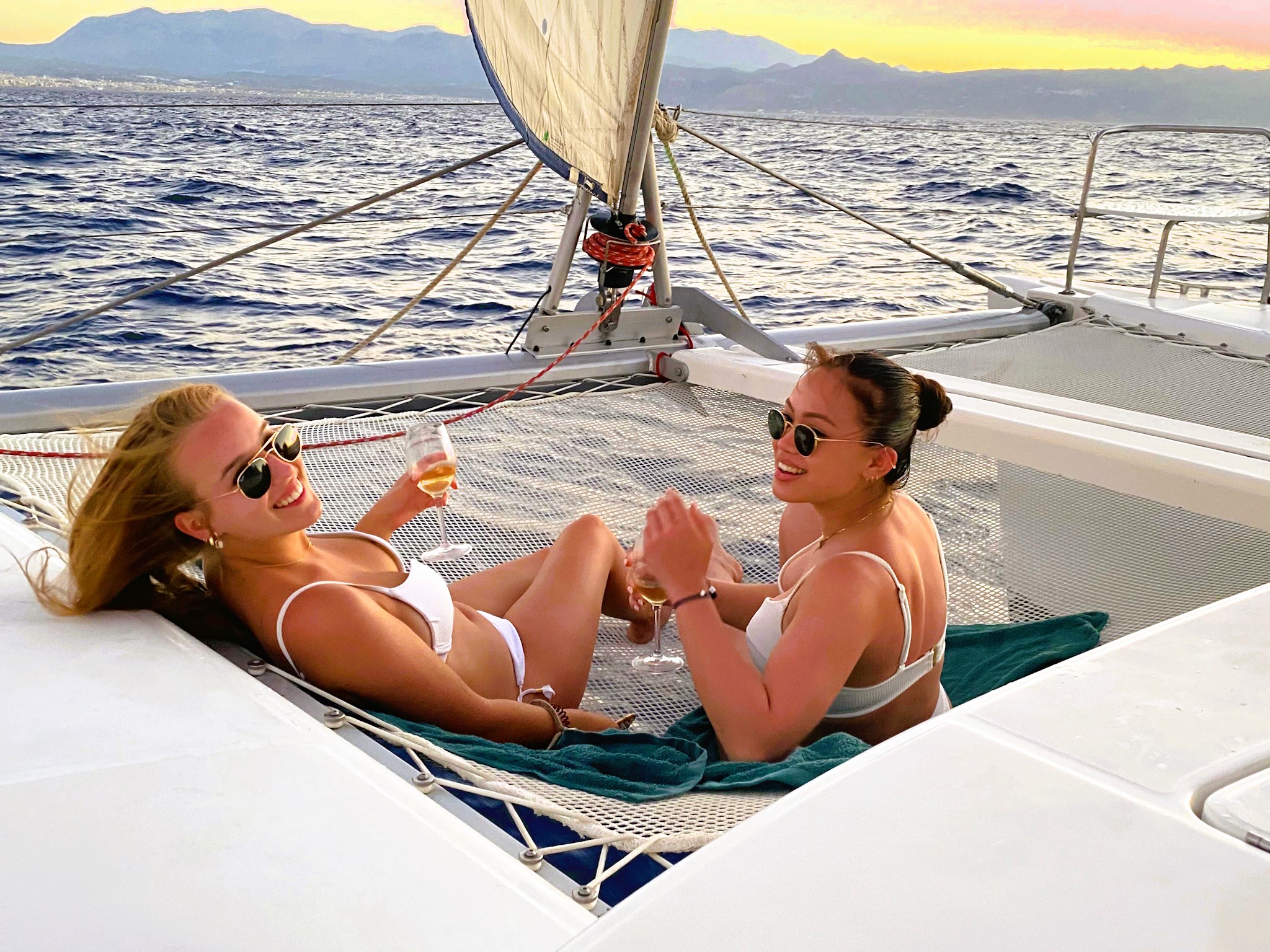 Während wir in der Nähe der Insel vor Anker gehen, werden wir euch leckere Häppchen servieren, welche aus den feinsten lokalen Zutaten zubereitet werden. Sobald die Sonne langsam zu sinken beginnt, steuern wir zurück zum Hafen von Chania, begleitet von den warmen Farbtönen der verblassenden Abendsonne, die atemberaubende Ausblicke auf die griechische Küste und die glitzernden Gewässer bietet.