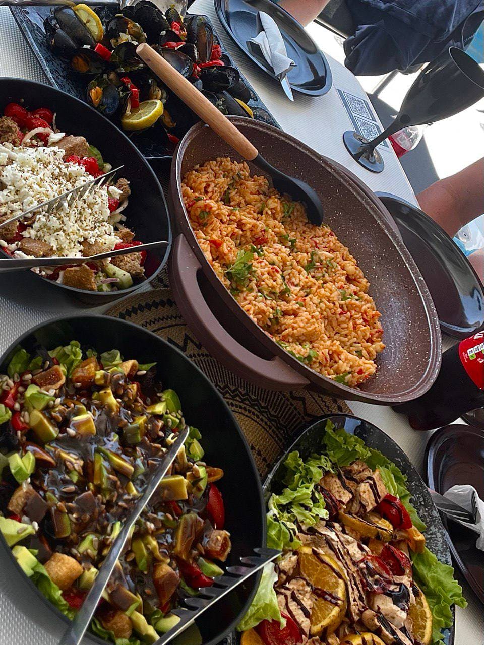 Mittagessen (Käseplatte aus der Region, grüner Salat „BIO“, griechischer Salat, traditionelle Nudeln mit Garnelen oder Reis mit Feta, Muscheln in Kurkuma-Sauce und Ouzo, Hähnchenbrust mit Orangen, Hähnchen-Nuggets oder Nudeln für Kinder, hausgemachte Süßigkeiten mit Obst)