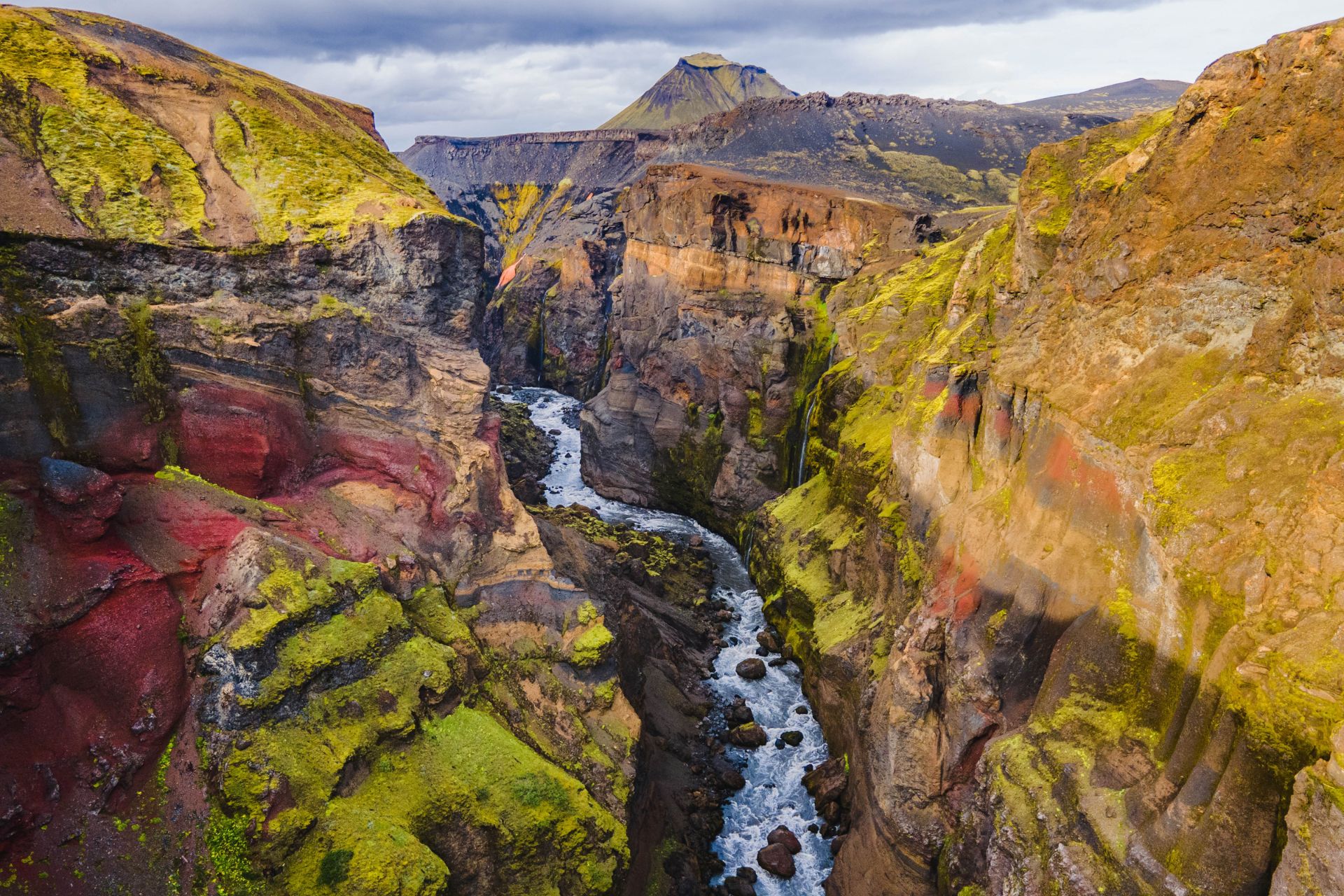 Wenn Ihr weiterzieht, erkundet Ihr vielleicht den ehrfurchtgebietenden Markarfljótsgljúfur-Canyon, in dem mächtige Lavawände einen Gletscherfluss einrahmen, und macht eventuell einen Zwischenstopp am malerischen Torfahlaup in der Nähe; je nach Tagesbedingungen könnt Ihr auch einen Blick auf den mächtigen Mt. Hekla erhaschen, einen der aktivsten Vulkane Islands, bevor Ihr das atemberaubende geothermische Gebiet von Landmannalaugar erreicht.