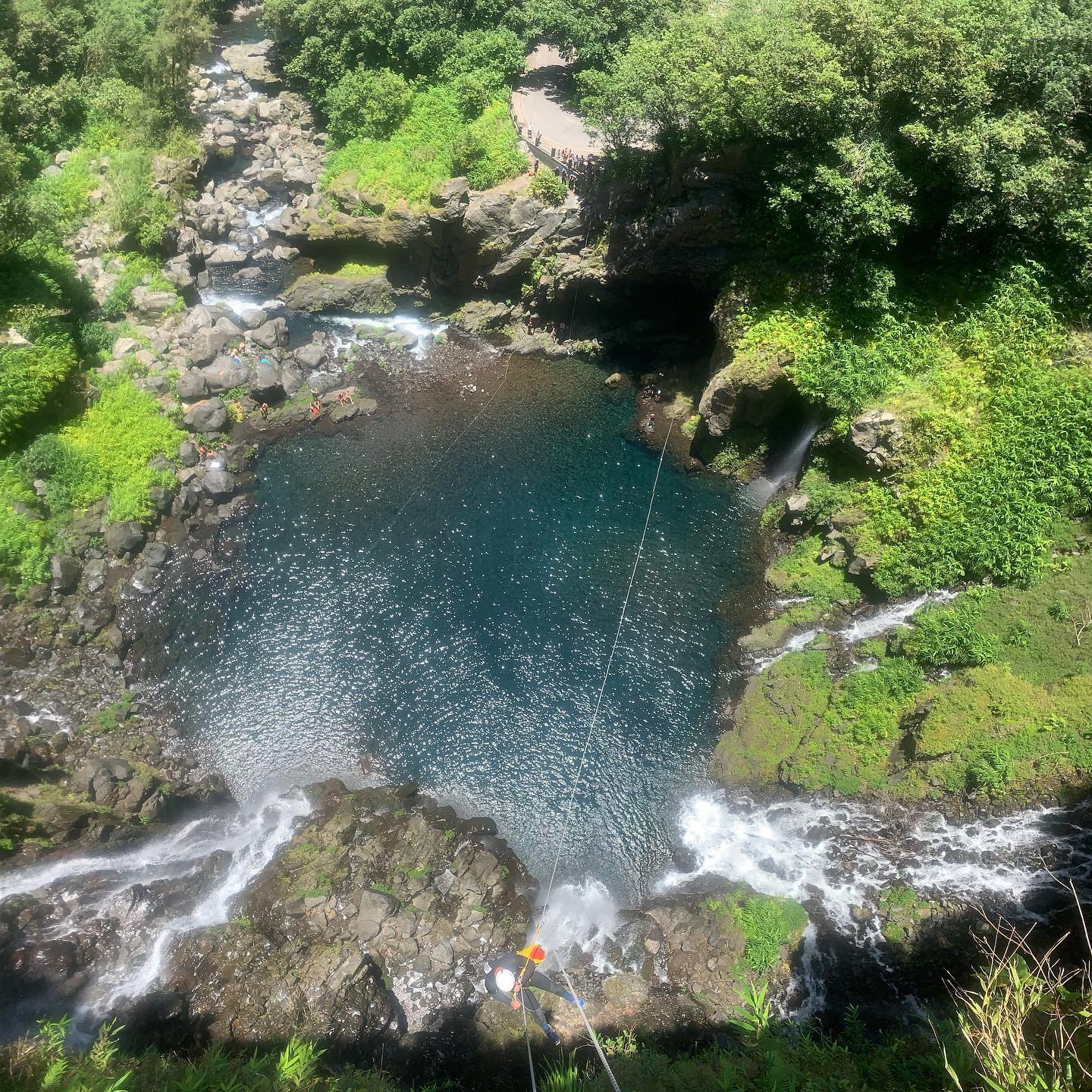 Weiter geht es mit einem aufregenden 25-Meter-Abseilen, das Euch auf die atemberaubende Aussicht am Gipfel der Kaskade de Grand Galet vorbereitet. Hier genießen wir einen kleinen Snack und Getränke, umgeben von der natürlichen Schönheit der Umgebung. Der Höhepunkt der Tour ist eine aufregende 85-Meter-Abseil-Seilrutsche, die über das Hauptbecken des Langevin-Flusses gleitet. Diese einzigartige Gelegenheit kombiniert den Nervenkitzel des Abseilens mit der Geschwindigkeit einer Seilrutsche und bietet panoramische Aussichten, die Ihr so schnell nicht vergessen werdet.