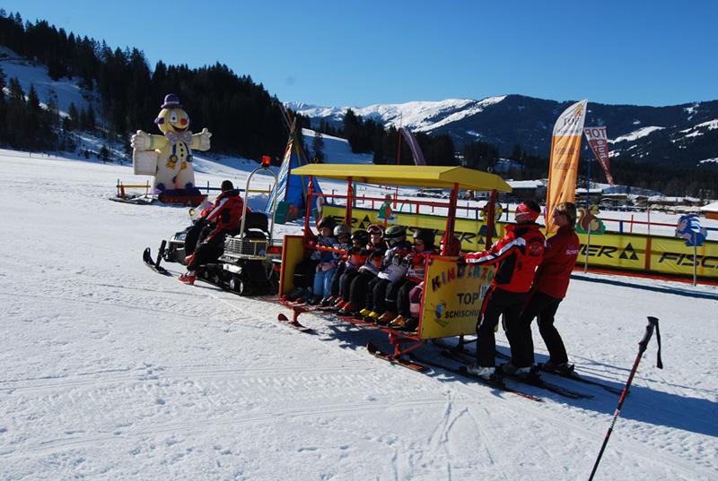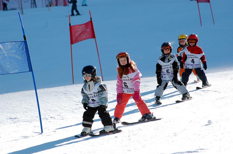 Beginners start with balance exercises, snowplough and braking, and soon take their first snowplough turns and small jumps on the fun course. Advanced children improve their carving, practise different turning techniques (long and short turns) and also try skiing in powder snow or on steeper slopes.
