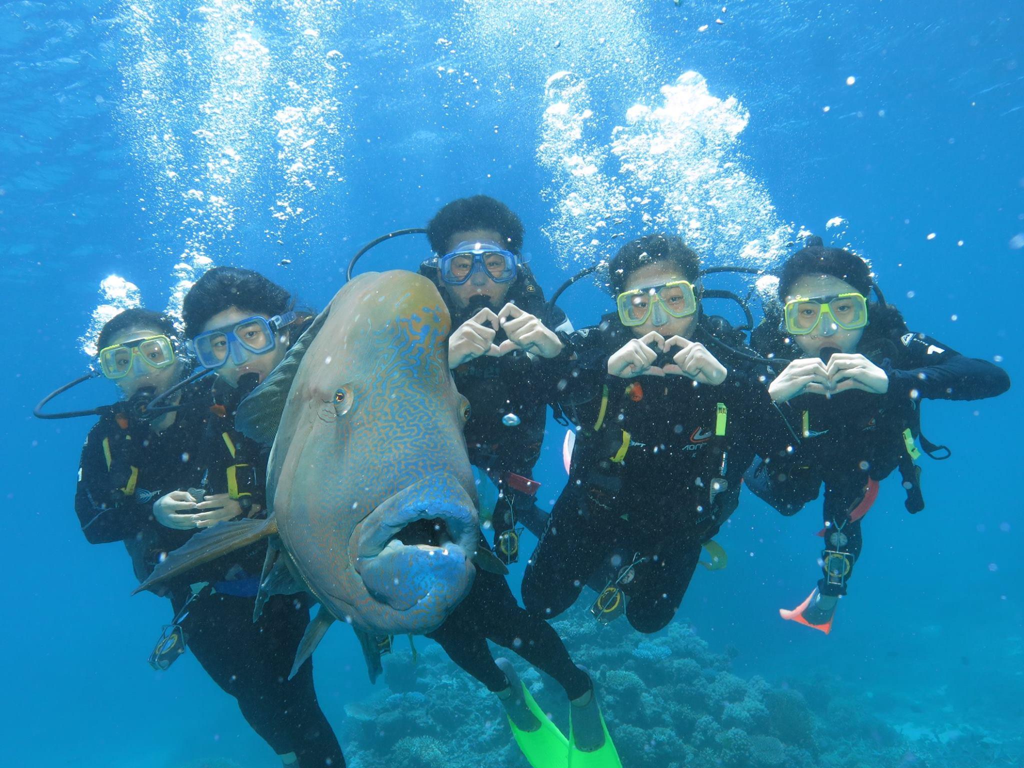 When you are ready, your instructor helps you to put on the equipment and guides you to the fascinating underwater world as deep as 12 metres (40 feet). In a group of maximum 8 divers per guide, you will spend approx. 30 min underwater before returning to the vessel and depart for a second site, where you can dive again. A tropical buffet lunch catered by a 5 star hotel follows while cruising to a third site. There, you can participate in a guided snorkel tour or take a second dive if you haven't already dived at the previous location. Having completed the 2nd dive, you will get a PADI certificate as a memento of your adventurous diving in Queensland. During the Great Barrier Reef boat tour, you will spend 5 hours in total at the reefs, so you have plenty of time to go snorkeling with your family or friends as well.