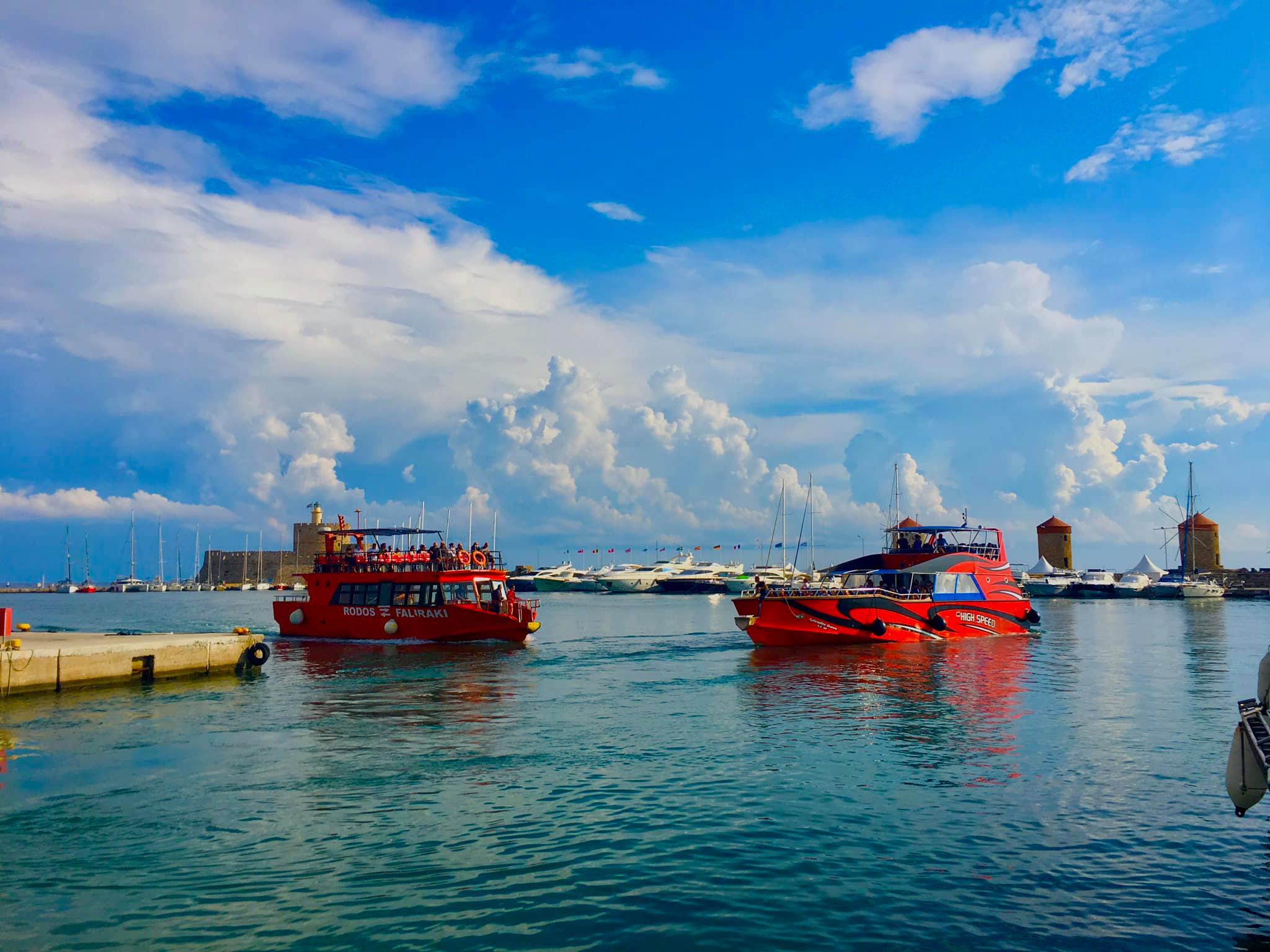 At the Kolymbia Harbor, in front of the red boat with "High Speed" written on it