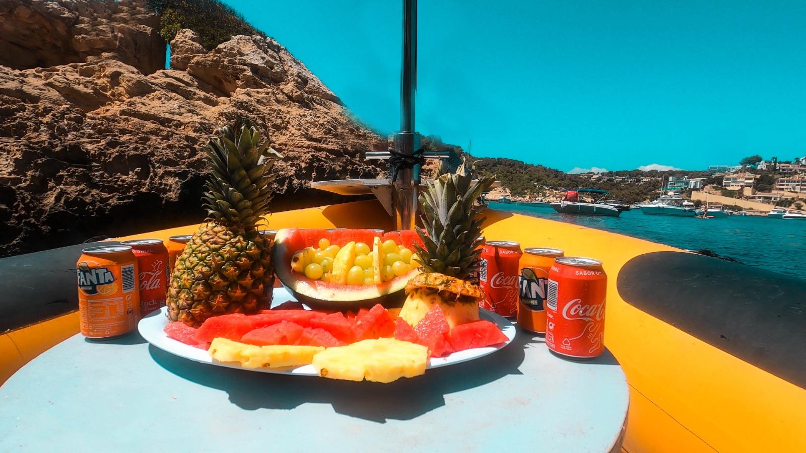 During these stops, you can jump into the blue water and enjoy the sun as you snorkel, paddle surf, try a seascooter and even go cliff jumping. If you prefer, you can relax onboard and enjoy some refreshing soft drinks and fresh fruit as you listen to some background music. After two hours, we will navigate at top speed while you enjoy a scenic route of southern Mallorca before arriving at Magaluf.
