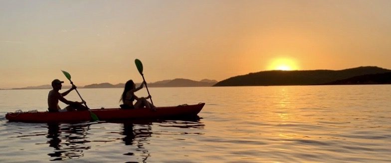 Don't miss the opportunity to paddle with us in the sunset light on the wonderful Sardinian Sea! During our sunset kayak tour to Proratora Island, you will enjoy the wonderful landscape of Capo Coda Cavallo from a different perspective, and reach with a kayak a calm island that hides a nice little cave and a quiet beach. Here we will have time to snorkel and to enjoy a small apéritif with music!