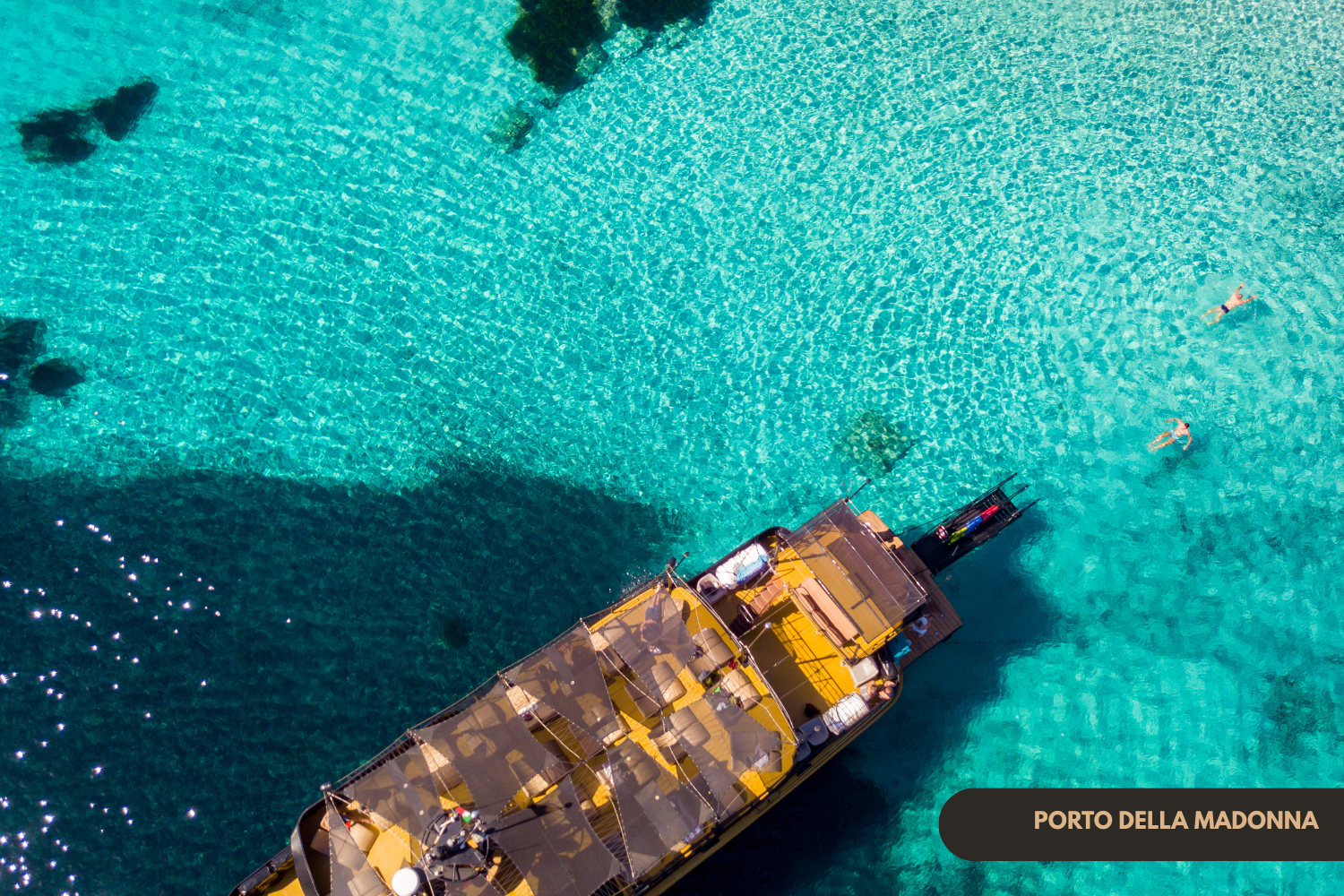 We’ll then head to the stunning Natural Pools of Porto della Madonna, where we stop for 90 minutes. You’ll also have the option to join a mini dinghy tour to discover hidden coves only accessible by small boats.