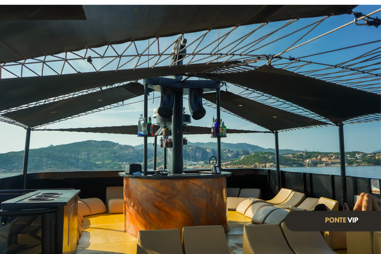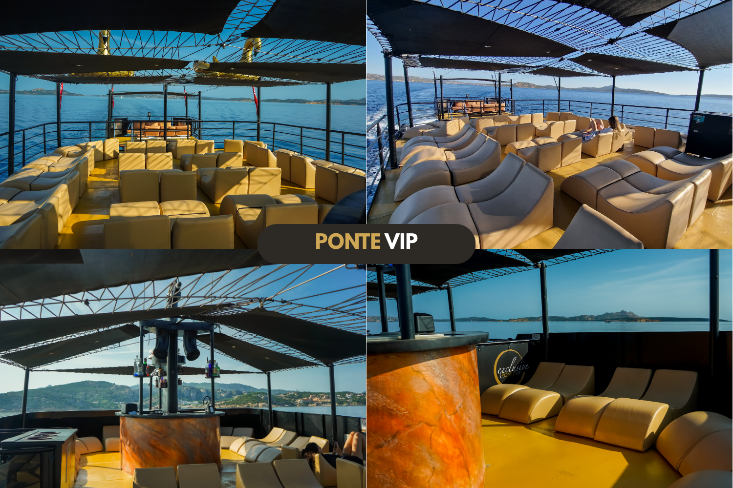 On board, enjoy two bars, a pizzeria, a dedicated hostess, and the comfort of the VIP panoramic deck with reserved chaise longues — for a refined and relaxing experience.