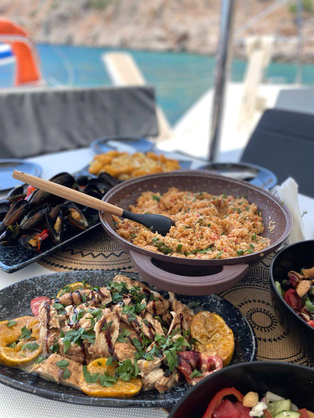 - Lunch (green salad “BIO”, Greek salad, pasta or rice with traditional shrimp saganaki with feta, traditional mussels in turmeric sauce and ouzo, chicken breast, chicken nuggets or pasta for children, fruits & homemade sweets. During the season, menu might change without prior notice (vegetarian alternative on request).