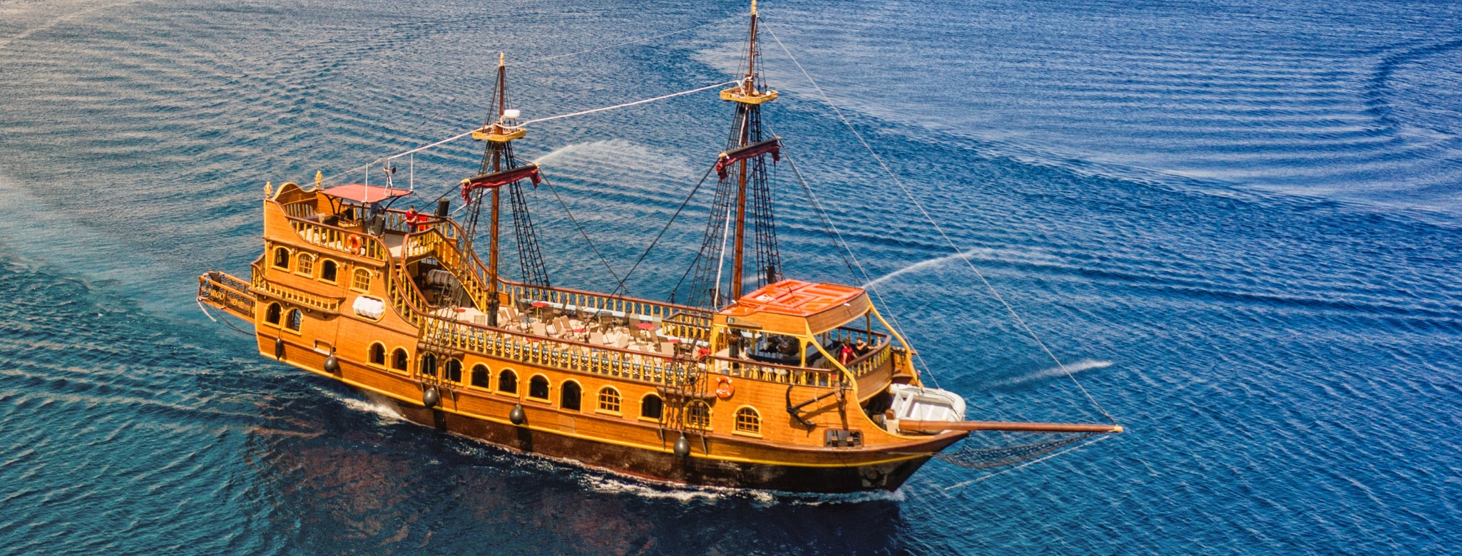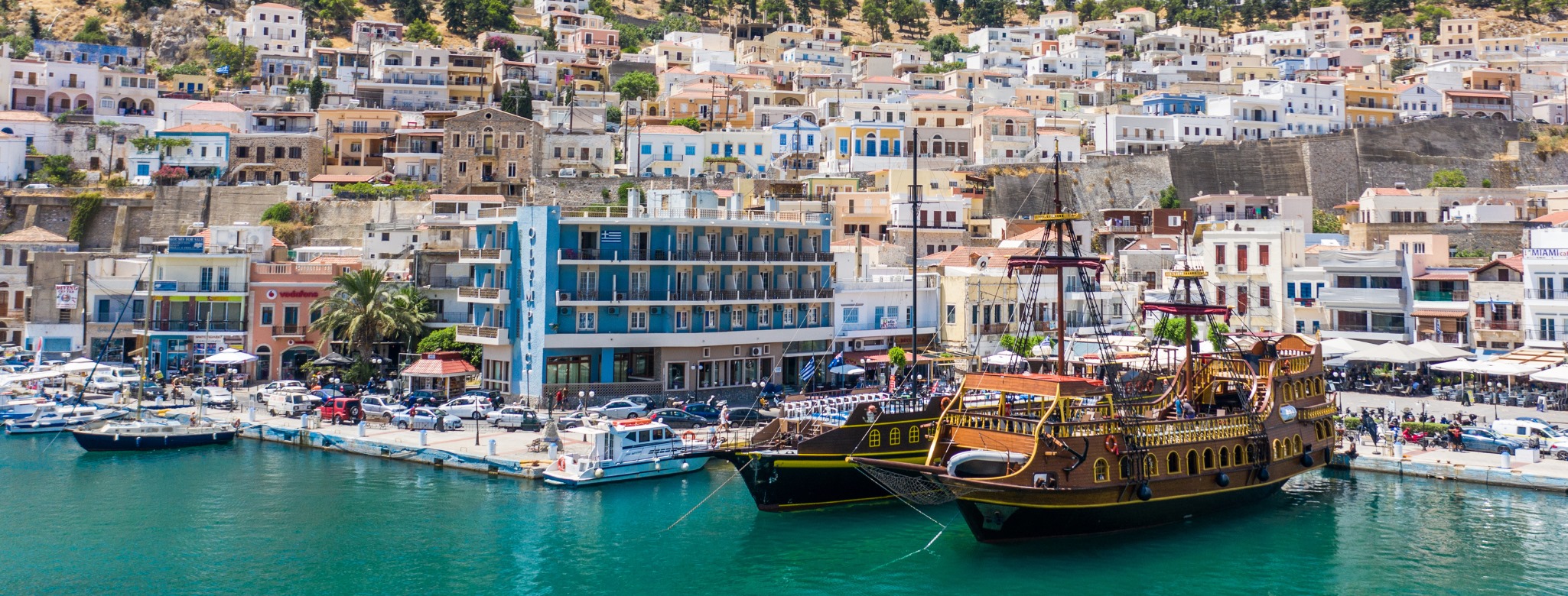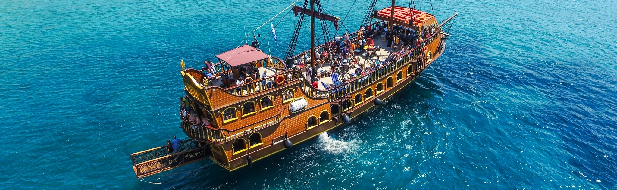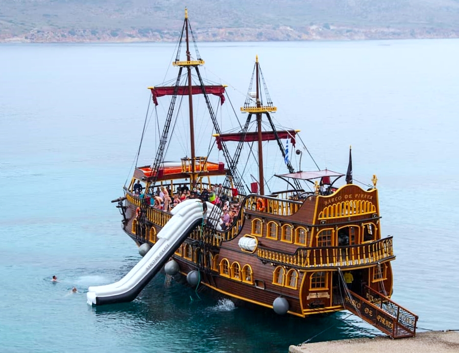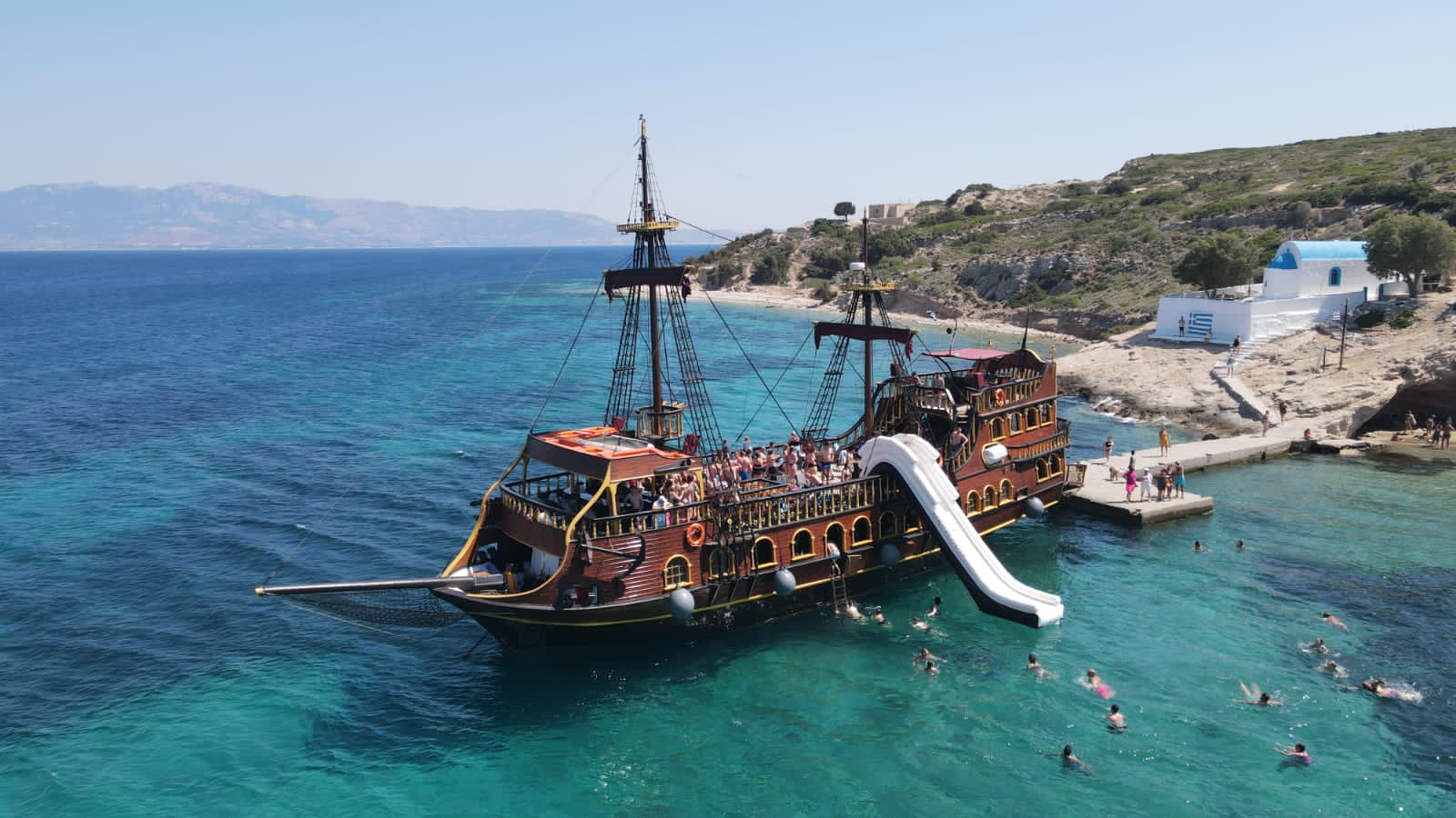What better way to discover the three Dodecanese islands than on our exciting pirate boat trip? Be part of a unique experience on board our large pirate boat that will take us to the beautiful islands of Kalymnos, Pserimos and Plati. You will get to discover picturesque towns, swim or snorkel in clear turquoise-blue waters and even slide down our fun waterslide!