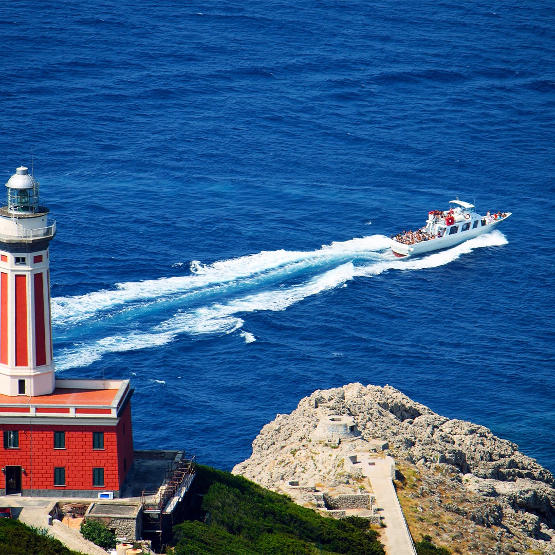 For our two-hour tour around Capri, we will meet at our office at the port of Marina Grande, where we will give you a detailed map of the island and accompany you to the boarding point. You will be amazed by the wild nature of Capri, admiring the incredible Natural Arch and the imposing Faraglioni, the symbol of Capri known worldwide. We will pass through the famous Arco dell'Amore dei Faraglioni and enter several caves, such as the White Grotto, the Wonderful Grotto and the Green Grotto. The captain will guide you to discover the most beautiful views, including the Punta Carena lighthouse, the second highest in Italy after that of Genoa, and the Villa of Curzio Malaparte.
