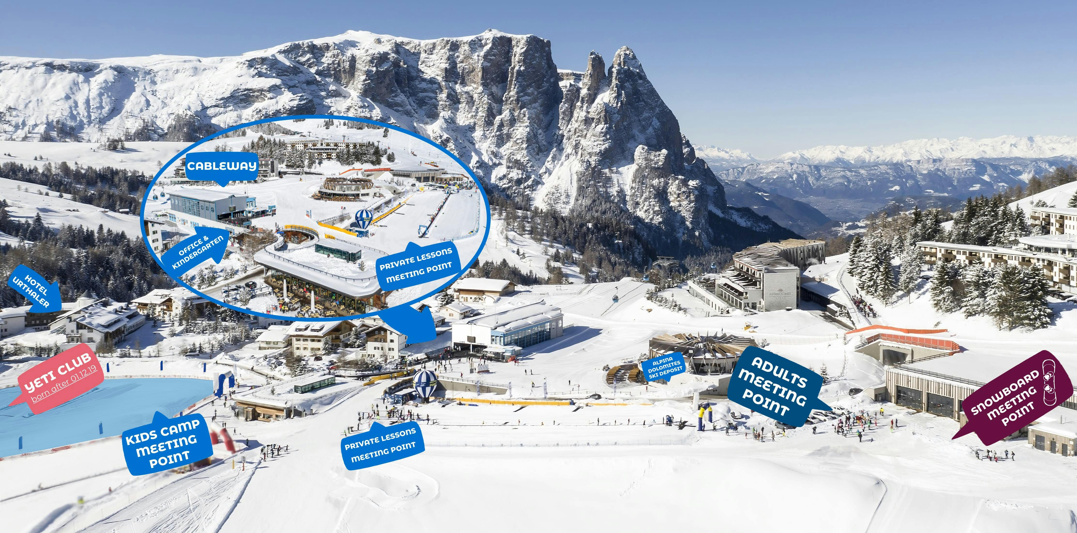 On the first day, we meet 15 minutes before the start of the lesson at the practice slope of the Schlern 3000 ski school (blue and white balloon) next to the "Seis - Seiser Alm" cable car exit. If you're not staying directly in Compatsch you can reach the meeting point with the "Seis-Seiser Alm" cable car. Consider 20 minutes of travel time.