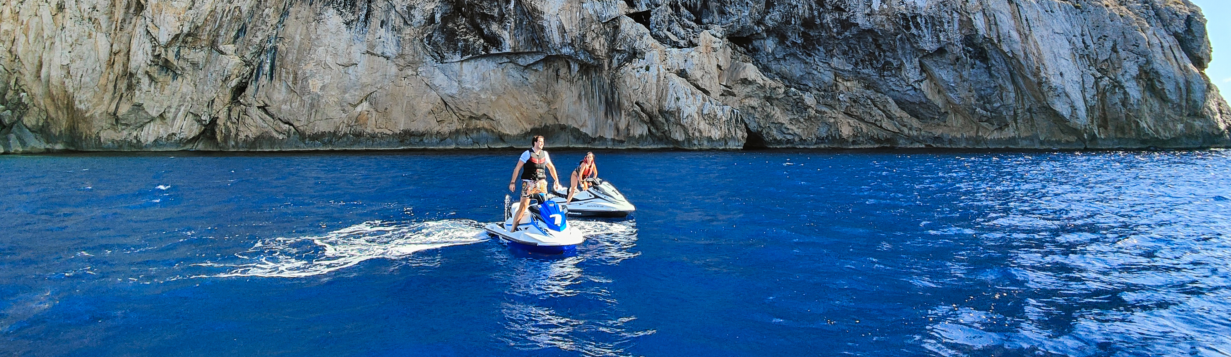 After a lesson on the basics of the jet ski, our local instructor will guide you to one of the most beautiful areas on the coast of Ibiza, the rocky island of Es Vedrà. On the way, you will enjoy natural landscapes such as Cala Bassa or Cala Comte, and when you reach the island you can get off the jet ski and enjoy a stop for swimming, snorkeling, or taking pictures. After 1.5 hours, you will return to the starting point.