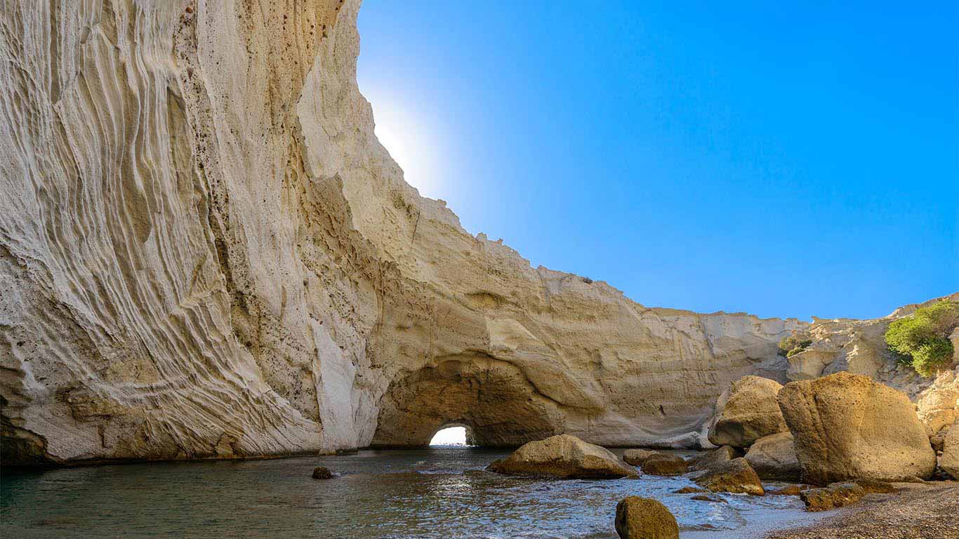 Our crew welcomes you in Adamantas port, from where we start our trip. We sail along the small fisherman houses of Klima, the rocky animal place Arkoudes and Cape Vani, the most northern point of the island that used to be a volcanic crater under the sea. Finally, we arrive at Kalogries, where you have 30 minutes to dive into the swallow water and to relax at the small and quiet beach. Navigating to our second swim stop of 45 minutes in Kleftiko, which is one of the most beautiful rock formations of the whole Mediterranean Sea, we also pass Sykia, an impressive open-top cave. Afterward, we spend 1 hour in Gerakas, a sandy beach with turquoise clear waters, that is only accessible by boat.