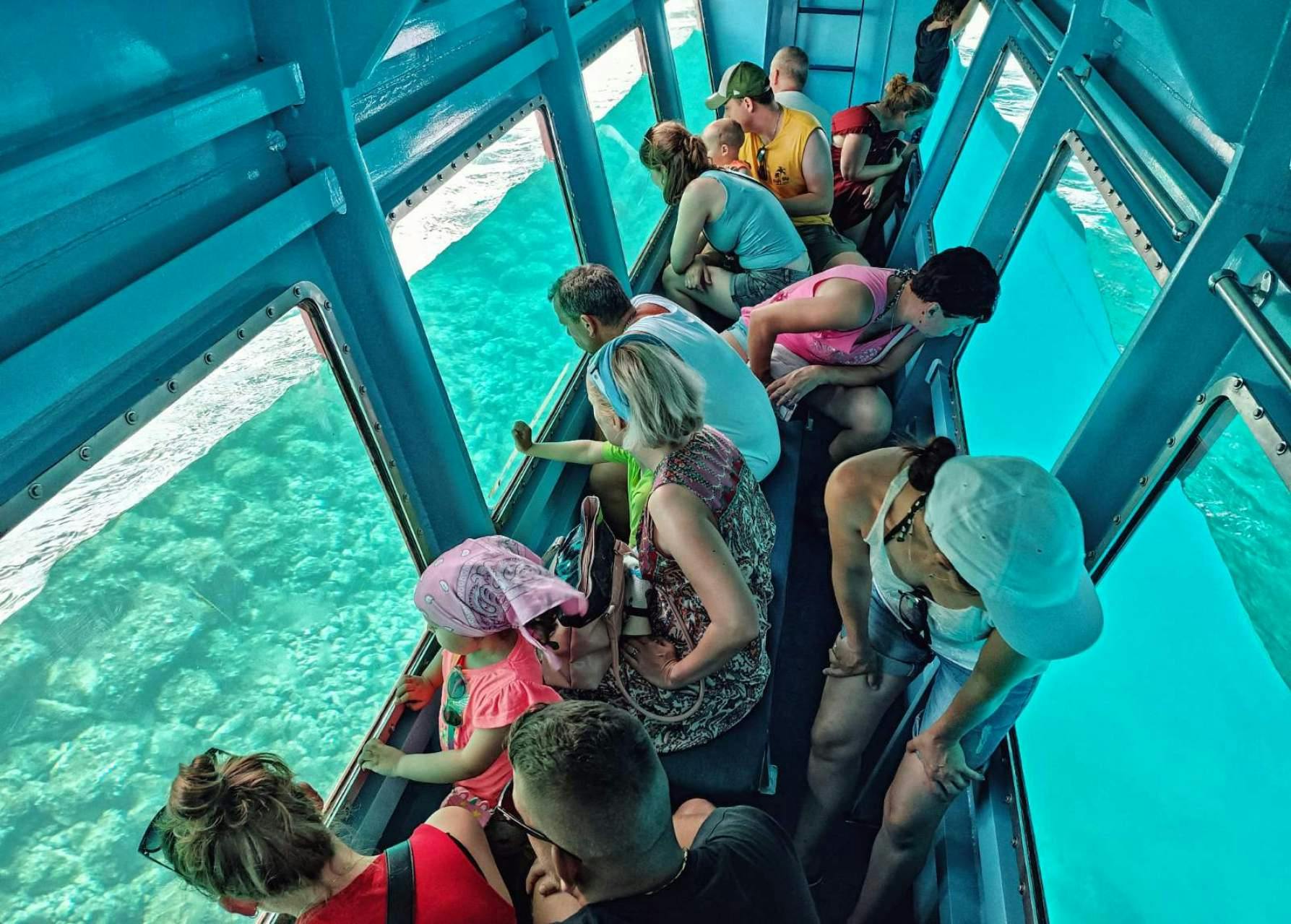 The crew is super friendly, the crossing is beautiful, and there are sunny and shady spots to suit your needs. The beach in Beli is packed with tourists, and the water is fantastic. The restaurant serves excellent fish, and there's a small kiosk with cold drinks, ice cream, bread, and even Nutella. The glass bottom can only be used when the boat is stationary or traveling very slowly; otherwise, you can't see anything through it.