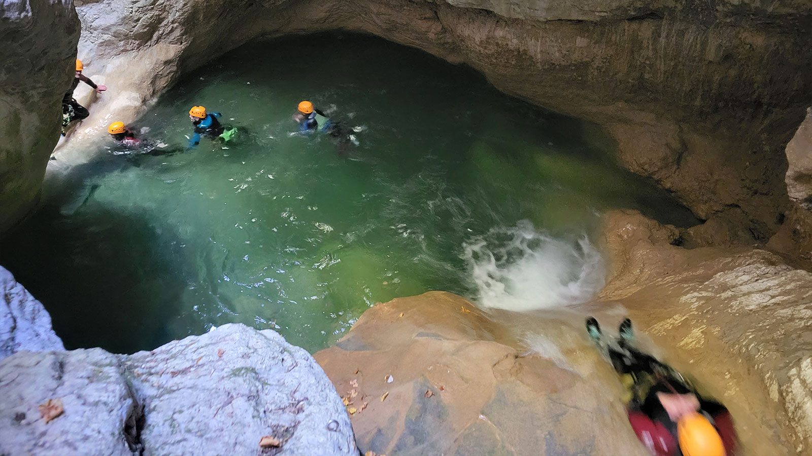 - Full canyoning equipment (wetsuit and neoprene socks, helmet, harness)