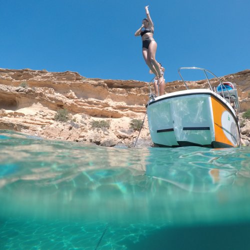 Discover the West Coast of Ibiza like never before with our unforgettable boat trip! Enjoy the thrill of stand-up paddleboarding (SUP) and relax with a refreshing mojito in hand. Choosing the course according and dependent on the weather and wind for optimal conditions, we will discover, in approximately 2 hours, the west coast of the island, such as Cala Conta and Cala Salada.
