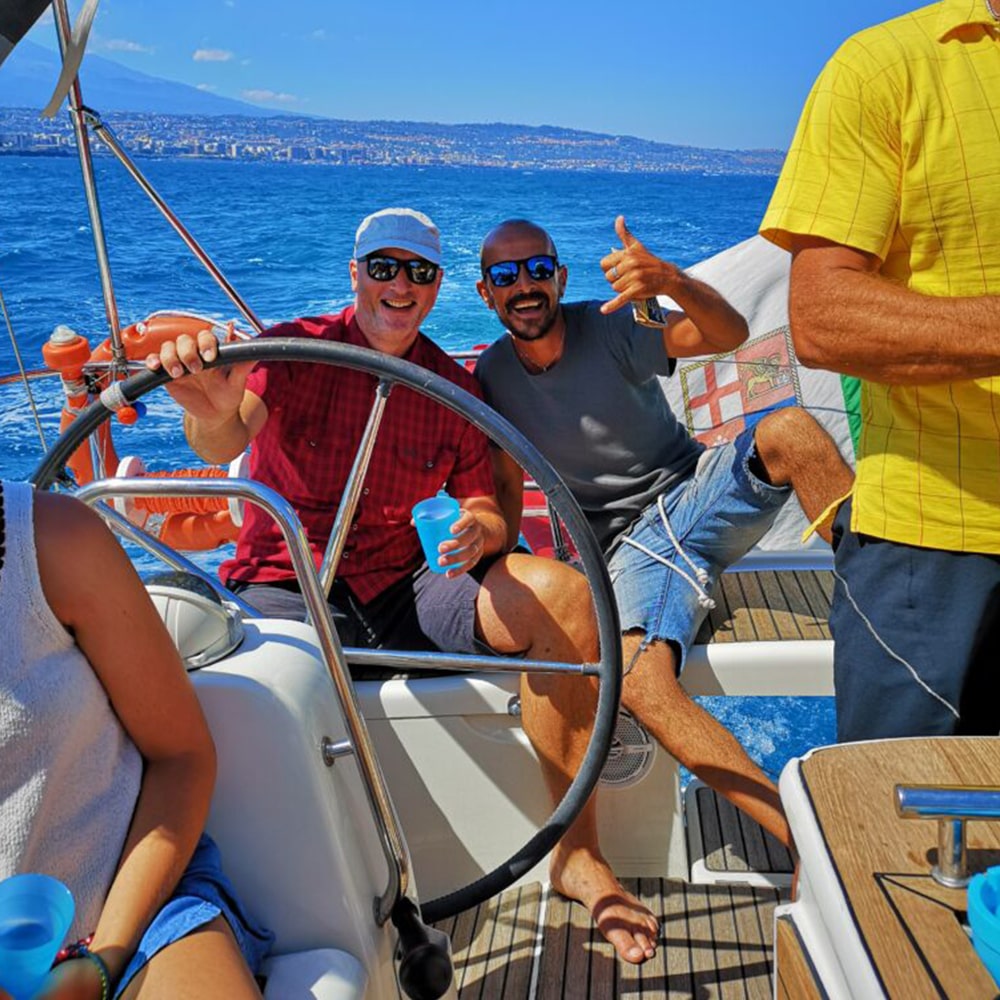 Explore the protected marine area of Cyclopean Islands, on board of a elegant and spacious sailing boat with our boat trip, with lunch included. We will depart from Catania and navigate along the coast, encountering locations like the Gulf of Etna and the fascinating Ulysses Caves. These caves, formed under a lava cliff that overlooks the sea, will be our first swim stop where you can dive into crystal-clear waters.