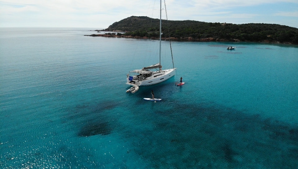 Enjoy an unforgettable day on the sea with our catamaran trip to Porquerolles with stopover, sup and snorkeling! Begin your adventure as we set off on our stunning catamaran, designed to accommodate up to 22 people. With large sunbathing areas and a shaded table for al fresco dining, the catamaran offers three distinct areas to relax: the front for sunbathing or lunch, the main salon with a large table for meals or relaxation, and the rear with a wide bench offering an incredible view of the sea. Under the guidance of our experienced skipper and crew member, enjoy your time on board with SUP, snorkeling equipment, and electric sea scooters included.
