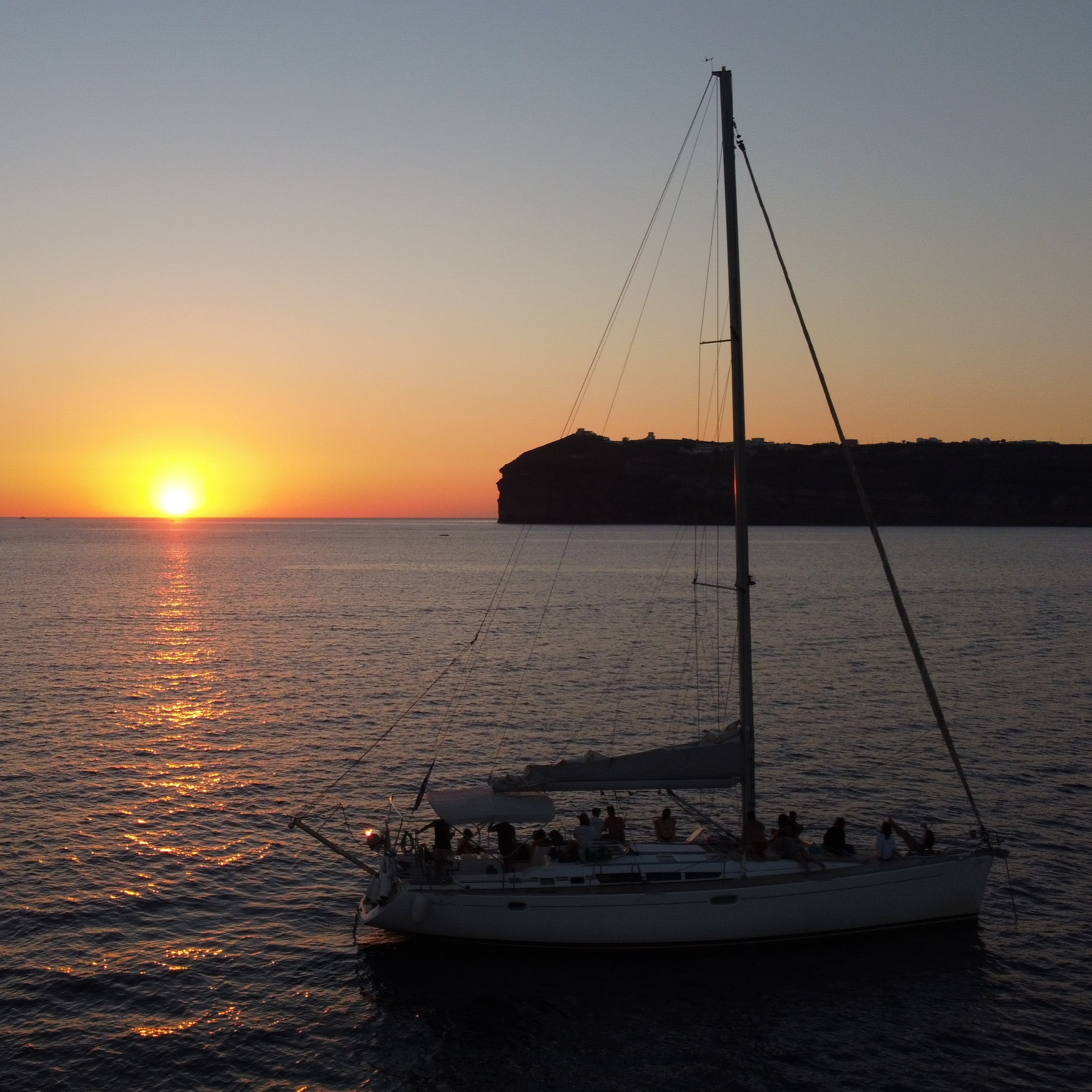 Embark on a stunning sunset boat trip adventure aboard our sailing boat in an especially private setting, exploring the Santorini coastline and discovering beautiful spots like White Beach, Red Beach, Akrotiri Lighthouse, and the Hot Springs. This private cruise is a great opportunity to sail and explore Santorini without hassle and responsibility, but with all the fun. You will be sailing the islands aboard a 49-foot sailing yacht, accommodating up to 10 guests in a spacious sitting area under the large tent or on the deck with cushions for sunbathing. Toilets and cabins are available inside the yacht.