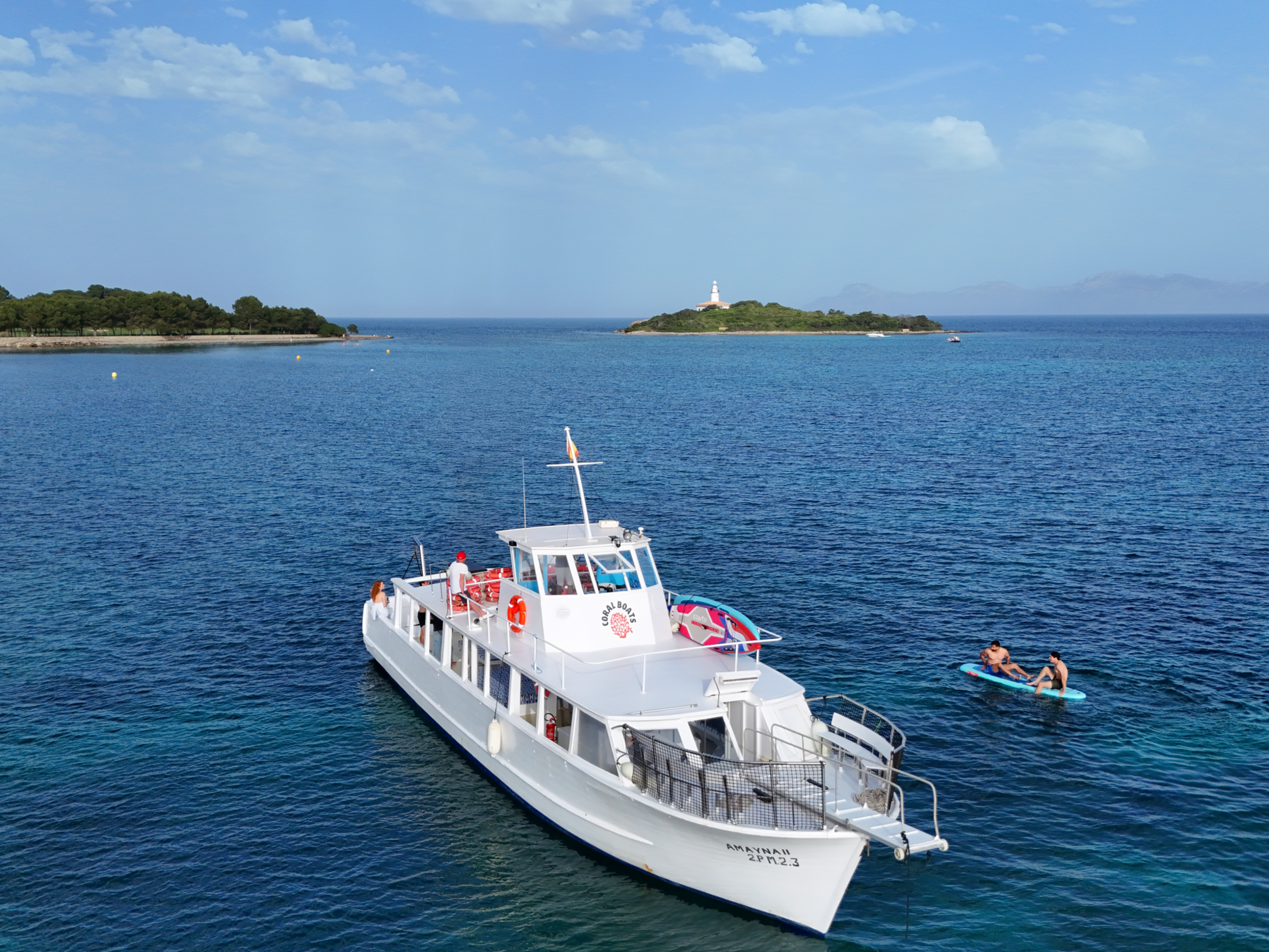As we make our way through the stunning Alcúdia Bay, you will have the opportunity to see the beautiful Alcanada area. Our main stop will be at Alcanada Beach, where you can enjoy a refreshing swim, go snorkeling to explore the underwater world, or try paddleboarding. This area is renowned for its crystal-clear waters and serene environment, perfect for relaxation and adventure.