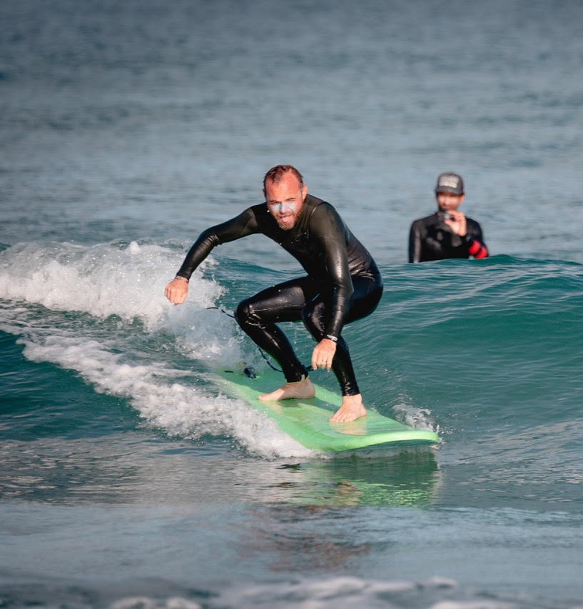 Nos encontramos 15 minutos antes del inicio de la clase directamente en la escuela. Se te atenderá en la recepción y se te proporcionará el equipo adaptado a tu edad y nivel: tabla de surf y traje de neopreno (niños de 6 a 11 años llevan traje de neopreno completo todo el año para permanecer cálidos y disfrutar de sus clases al máximo). Después, dirección a la playa, donde conocerás a tu instructor.