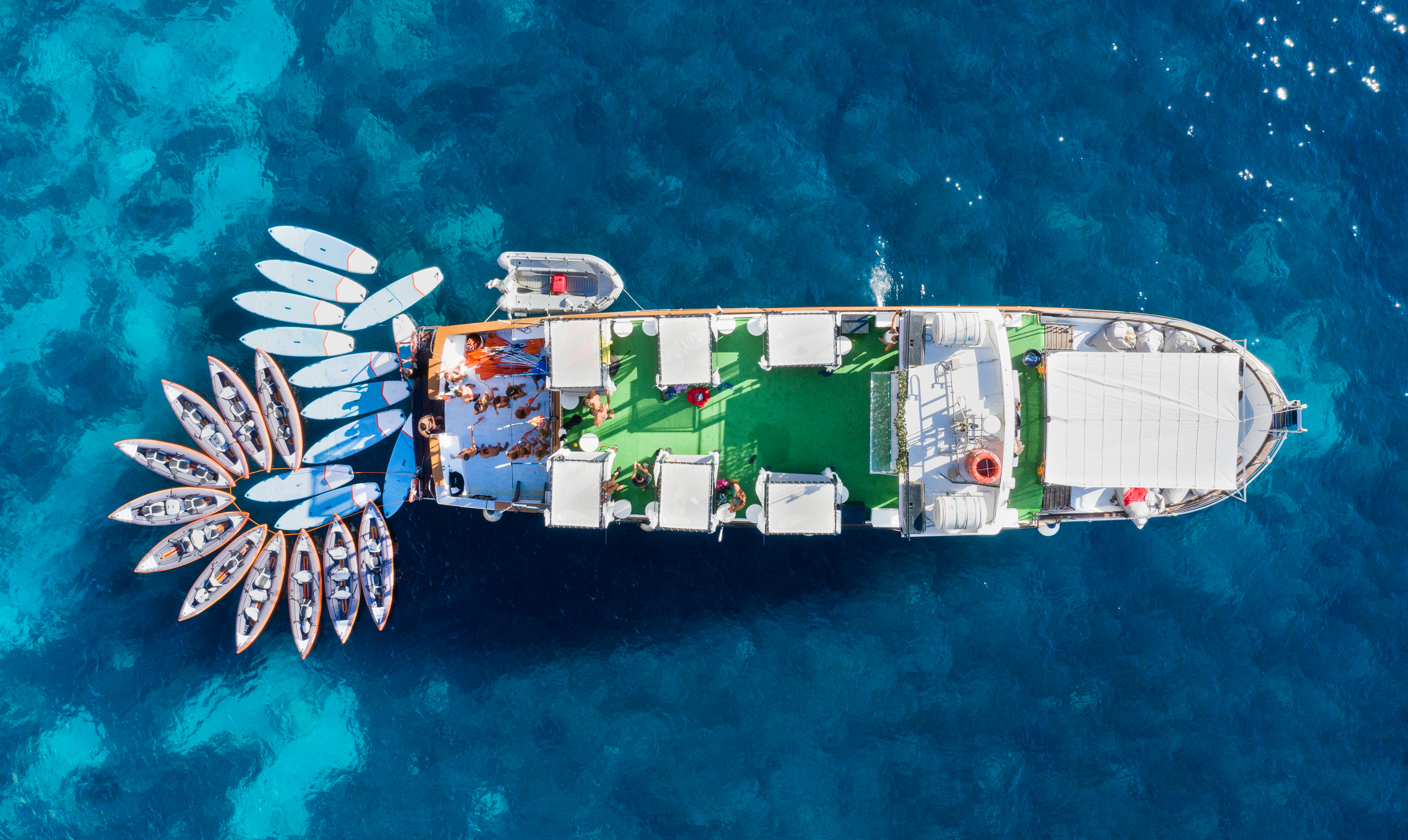 Partiremos desde la playa d'en Bossa y navegaremos a bordo de nuestro barco, dónde un desayuno local y bebidas ilimitadas te estarán esperando mientras atraviesas el Parque natural de Ses Salines, especial por su biodiversidad y valor cultural. Una vez llegados a Formentera haremos una parada cerca de S'Espalmador y Ses Illetes, una de las playas más importantes de Europa, donde podrás darte un baño, hacer esnórquel, o utilizar las tablas de paddle board a bordo mientras disfrutas de una tradicional paella ibicenca.