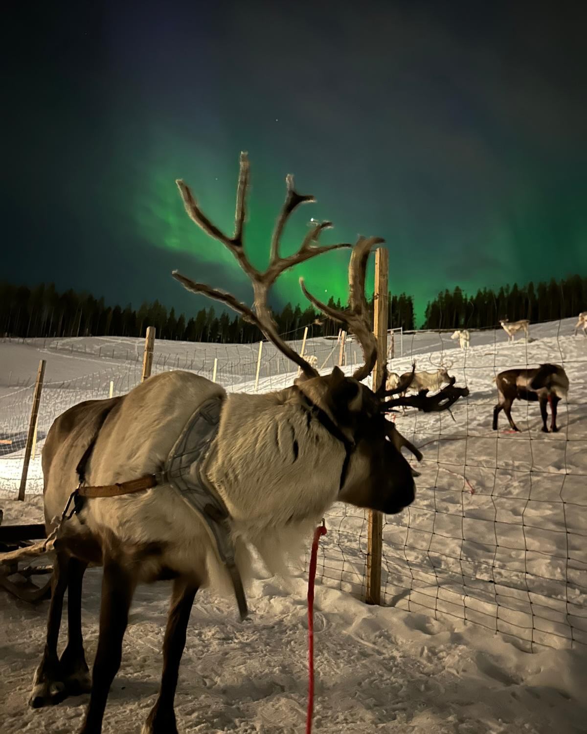 Al dejar atrás el bosque, el paisaje ártico abierto se despliega a tu alrededor, con colinas cubiertas de nieve y vastos panoramas que se extienden en la noche. Mantén los ojos en el cielo mientras las auroras boreales brillan y se mueven sobre ti, mientras respiras el aire fresco y limpio del Ártico. La experiencia ofrece una perspectiva única que solo un trineo de renos puede proporcionar, perfecta para capturar momentos inolvidables y fotografías impresionantes de la aurora.