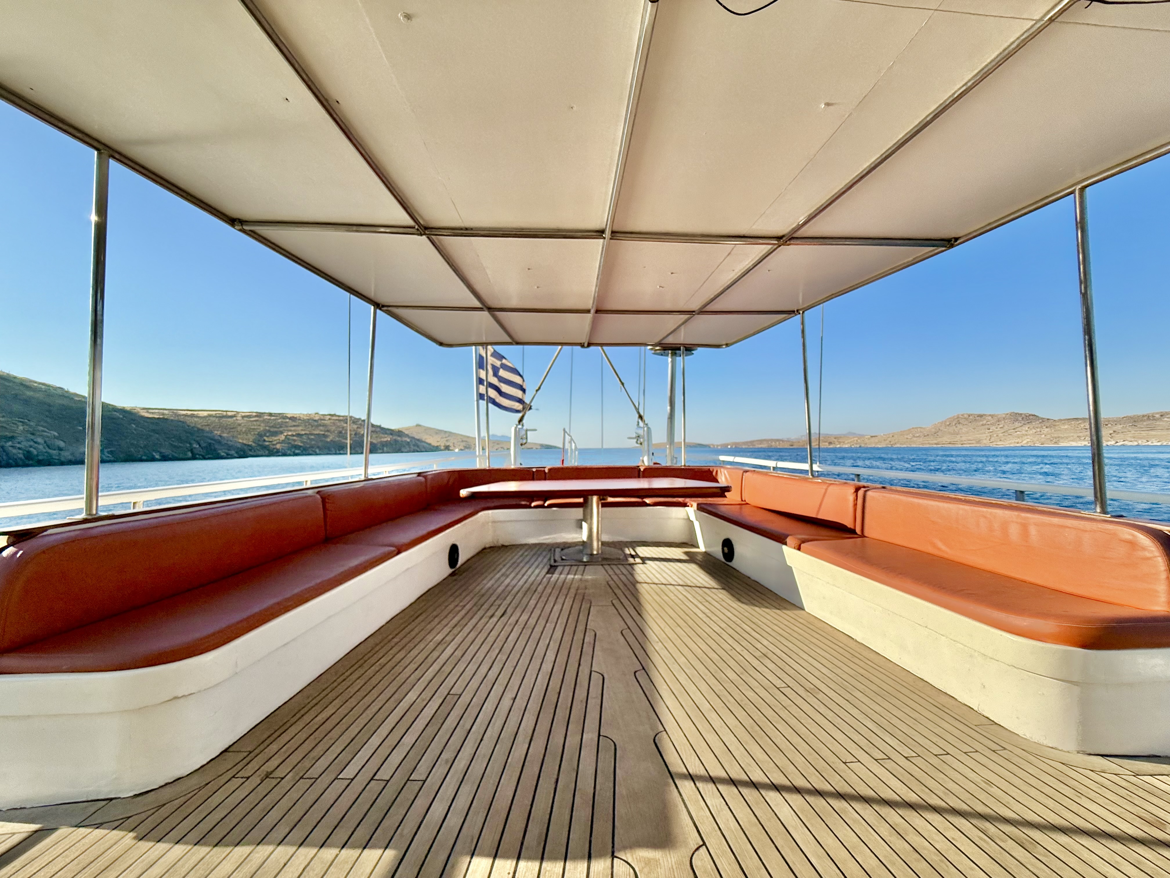 Vous pourrez y découvrir le site archéologique lors d'une visite guidée. Le site était un lieu sacré pour les Grecs dans l'Antiquité en raison de son sanctuaire d'Apollon. Cette balade culturelle sur l'île dure environ 1 h 30. Ceux qui souhaiteront renoncer au programme culturel pourront profiter du temps passé sur le bateau et plonger dans les eaux cristallines du golfe.