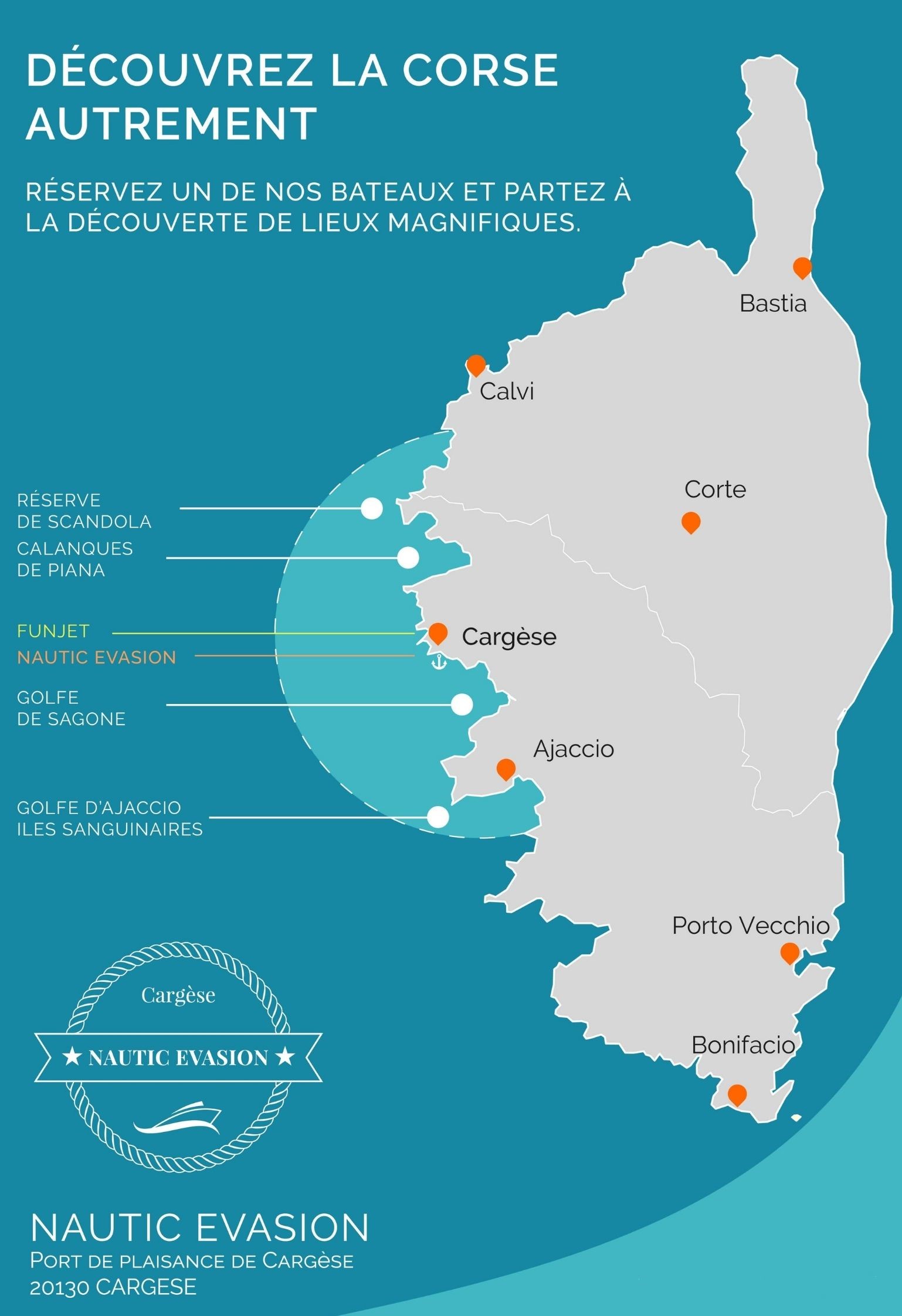 Si vous préférez vous rendre au sud, préparez-vous à être tout aussi surpris. En vous rendant à Ajaccio, la ville natale de Napoléon Bonaparte, vous pourrez prendre des photos uniques des eaux cristallines qui vous entourent. Naviguez dans le captivant golfe de Sagone, où vous découvrirez de nombreuses criques rocheuses, de charmants villages côtiers, des plages de sable et des paysages à couper le souffle. Un autre lieu touristique à ne pas manquer dans la région sont les îles Sanguinaires, un archipel de quatre îles distinctes très appréciées des touristes. Grâce aux innombrables possibilités offertes, vous êtes assuré de passer une journée inoubliable sur la mer Méditerranée, entouré de la beauté inégalée de l'une des îles les plus enchanteresses du monde. Nous vous promettons des souvenirs inoubliables et des moments précieux avec vos proches. Enfin, lorsque la journée touche à sa fin, vous ramenez le bateau au port de plaisance de Cargèse pour conclure votre remarquable balade.Départ & Retour