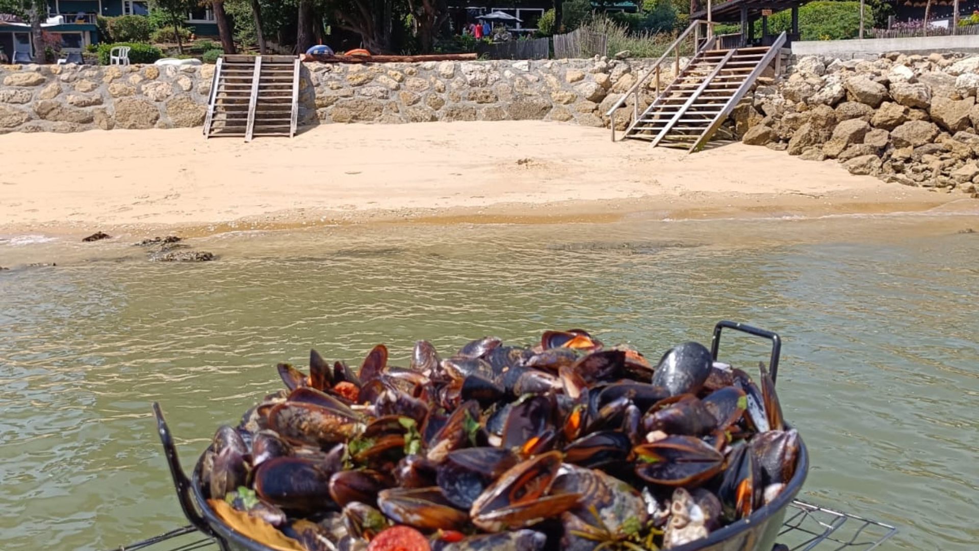 Grande planche : 12 huîtres, 2 saucisses grillées ou crevettes grillées et sauce aioli (en fonction du nombre de réservations), 1 verre de vin blanc ; 25 € par personne