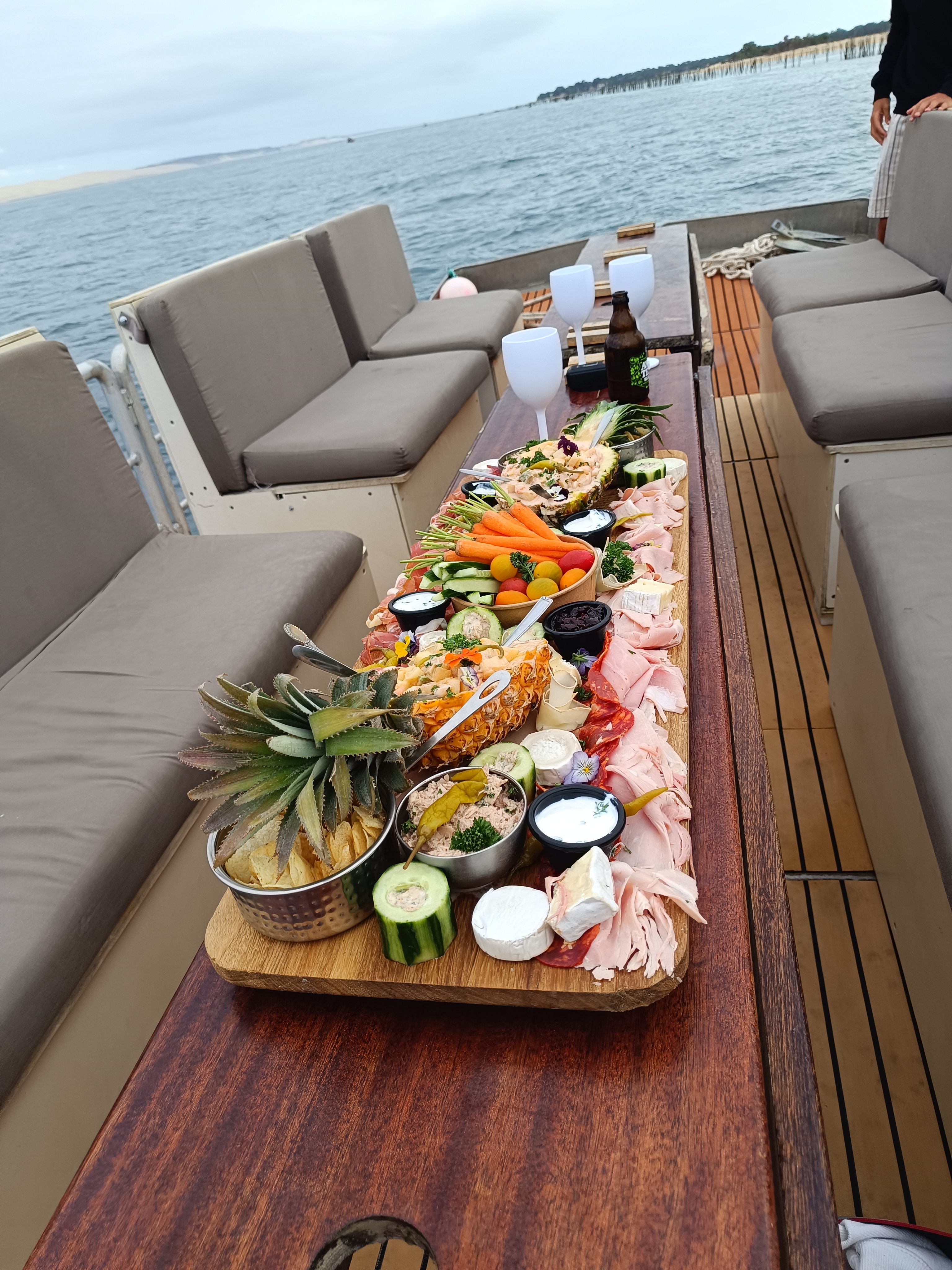 Grande planche : 12 huîtres, 2 saucisses grillées ou crevettes grillées et sauce aioli (en fonction du nombre de réservations), 1 verre de vin blanc ; 25 € par personne