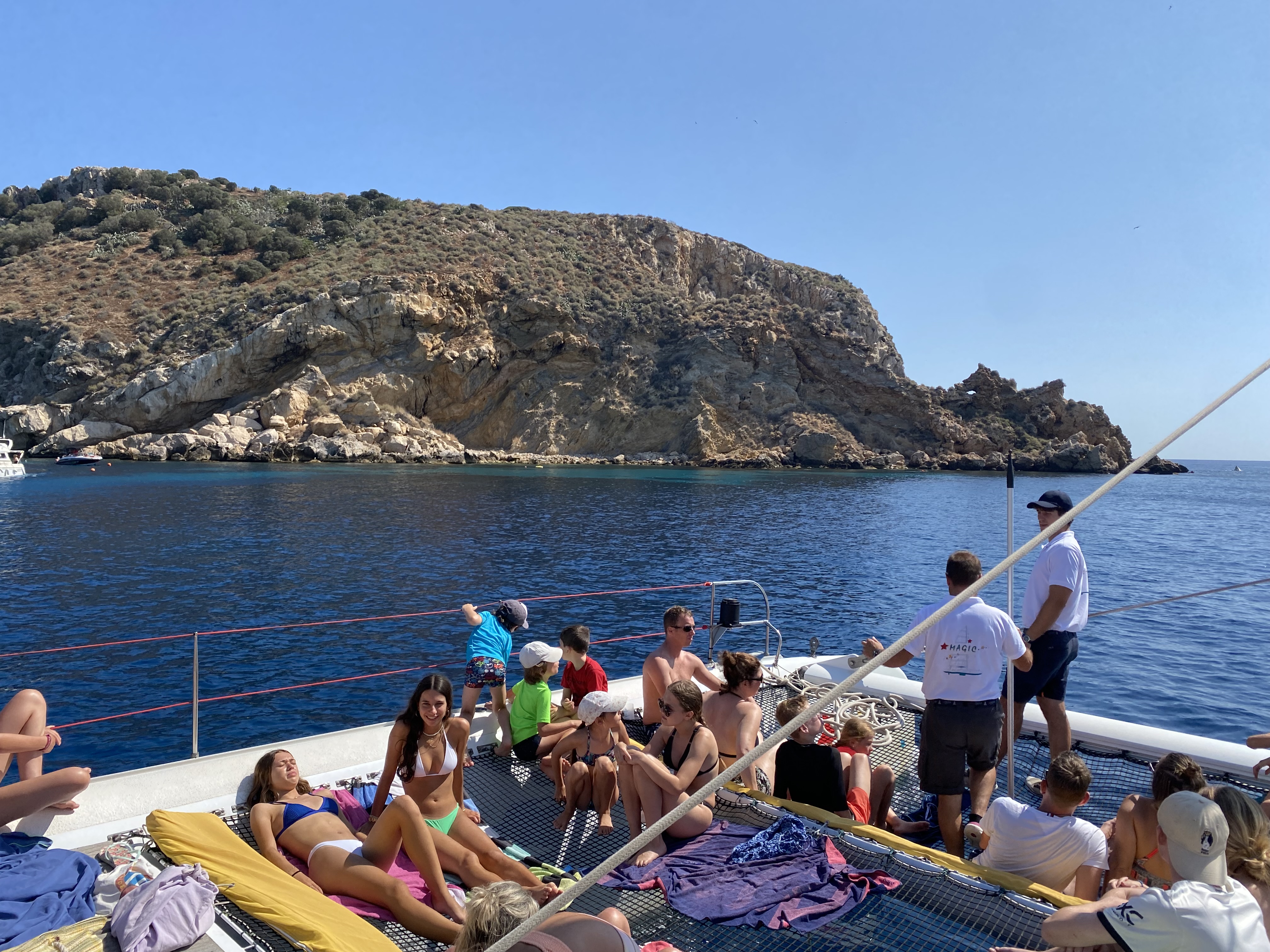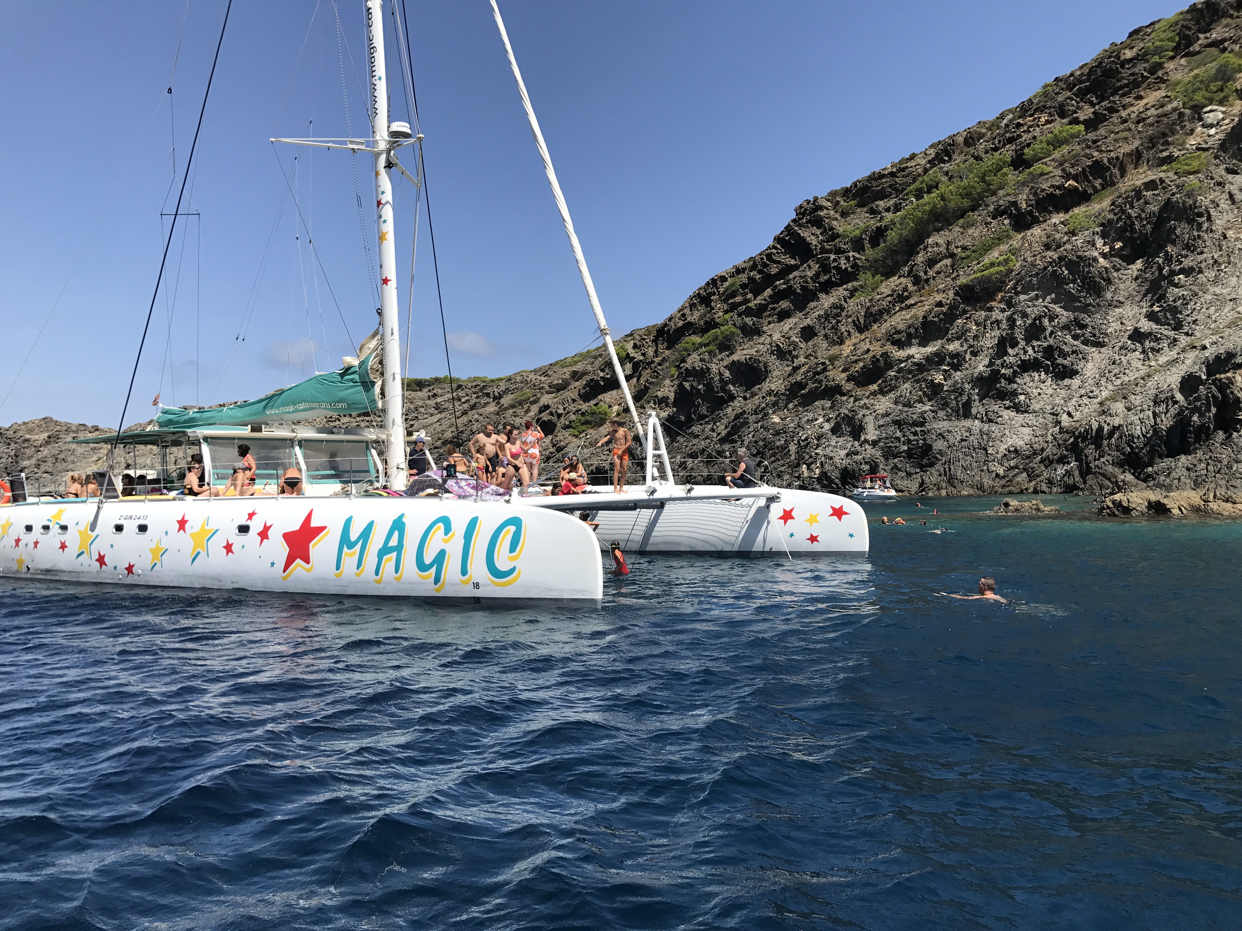 Vivi un indimenticabile tour in catamarano lungo la Costa Brava da Palamós, con soste per nuotare alle Isole Formigues e a Cap Roig, acque cristalline e comfort rilassante a bordo. Inizia il viaggio lungo la splendida costa della Costa Brava a bordo del spazioso catamarano Magic. Questo catamarano offre aree di seduta imbottite sia al sole che all'ombra, oltre a reti per prendere il sole sul davanti per il massimo relax. La prima sosta è alle Isole Formigues, dove puoi tuffarti nelle acque cristalline del Mediterraneo per un bagno rinfrescante o provare lo snorkeling con l'attrezzatura fornita per esplorare la vivace vita marina.