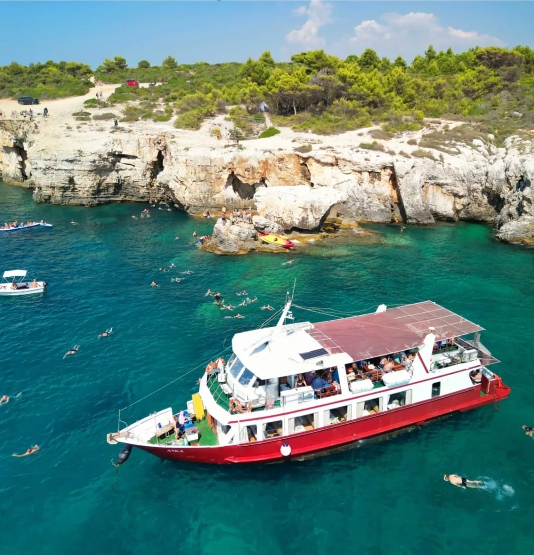 Ci incontriamo nel porto di Medolino, 30 minuti prima dell'orario di partenza prenotato. Ci trovate di fronte alla barca Sandra, al grande ombrellone rosso. Se arrivate in macchina, c'è un parcheggio a pagamento proprio di fronte al porto. Dopo 5 o 6 ore, ritorneremo nello stesso punto da cui siamo partiti.