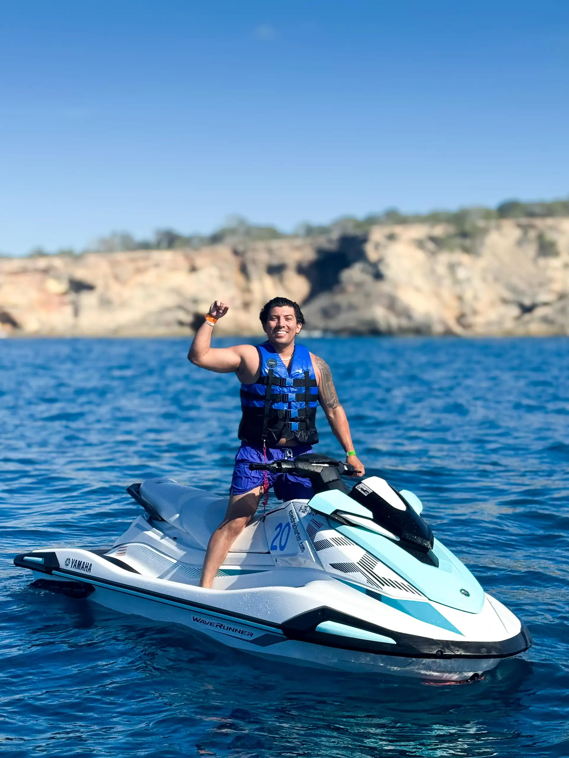 Prenotate un'escursione in moto d'acqua a Cala D' Albarca e scoprite la costa di Ibiza senza patente da San Antonio (Sant Antoni de Portmany). Percorrete la costa nord fino a raggiungere una delle calette più isolate ed esclusive di Ibiza, con grandi scogliere, acque cristalline e un caratteristico ponte naturale. Sulla moto d'acqua si può andare da soli o con un amico.