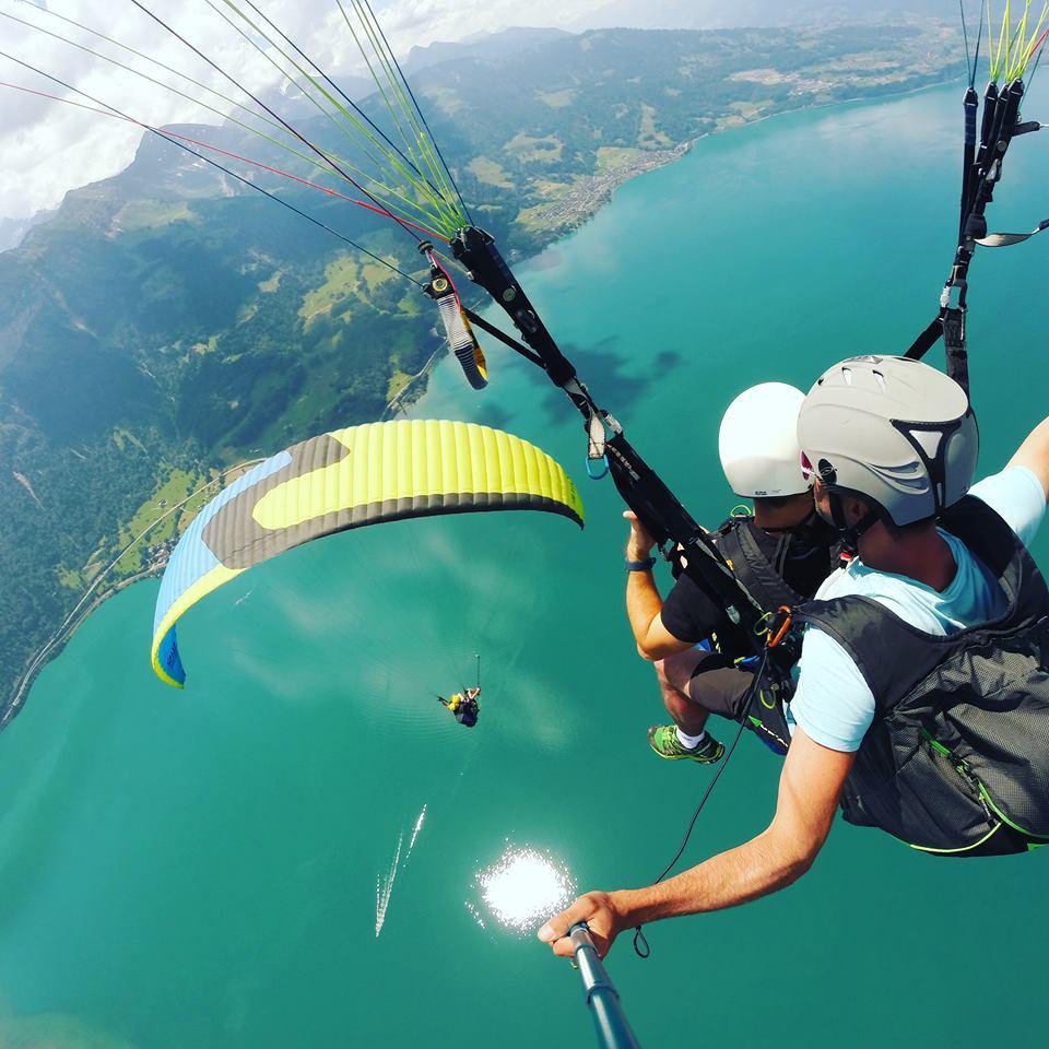 Over een flauwe helling zet je een paar passen tegen de wind in en ben je al in de lucht. Op een tandemvlucht zit je voor de piloot, zodat je achterover kunt leunen en genieten van het adembenemende uitzicht van het berg- en merenlandschap. Tijdens de vlucht maakt de piloot foto's en video's in HD-kwaliteit, die je daarna kunt bekijken en desgewenst voor 40 CHF op een USB-stick kunt kopen of direct naar je telefoon kunt laten sturen.