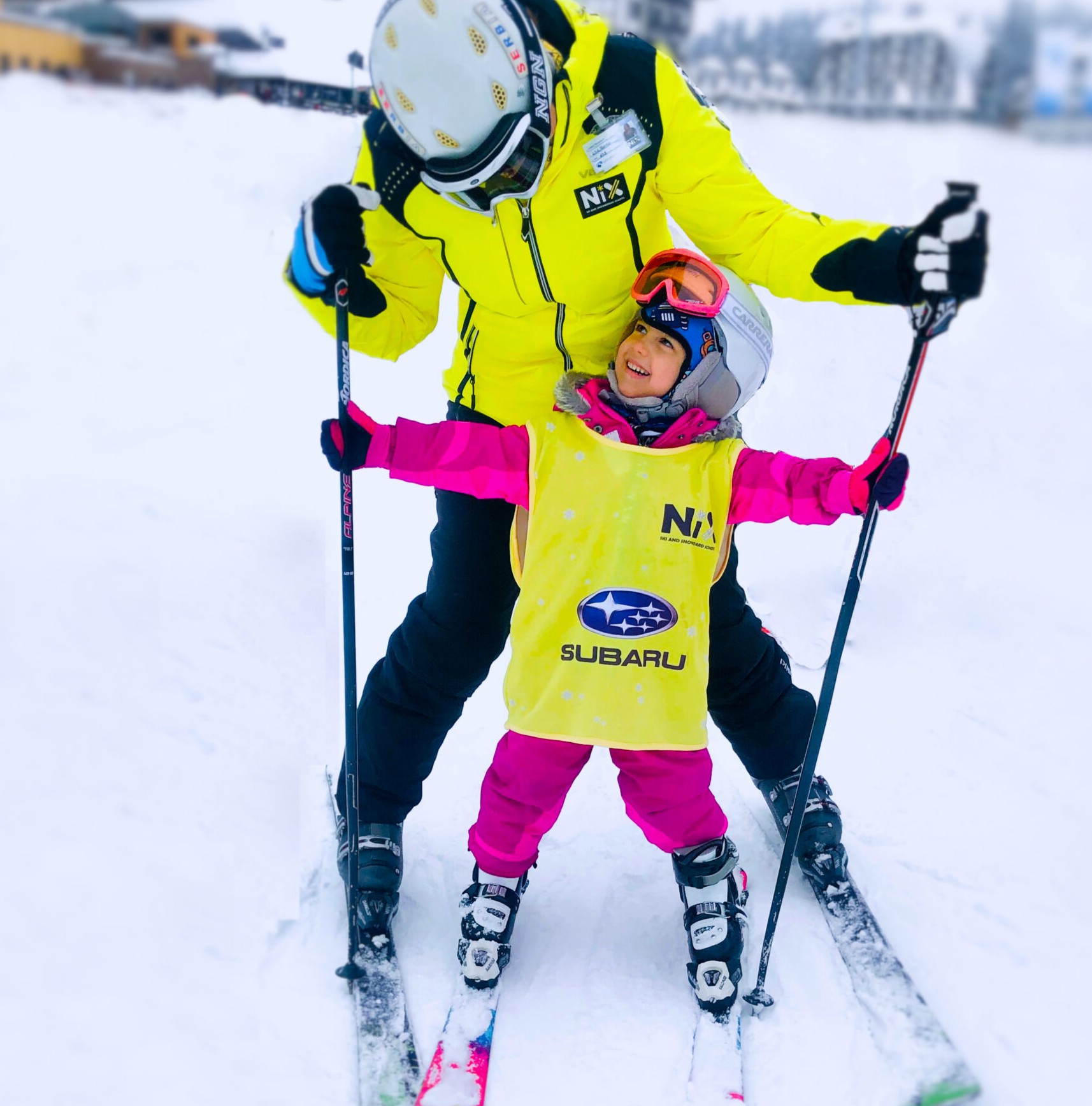 We ontmoeten elkaar voor de skikinderopvang naast het kleine NIX-vlaggetje (onze instructeurs dragen gele jassen), op de geboekte tijd.