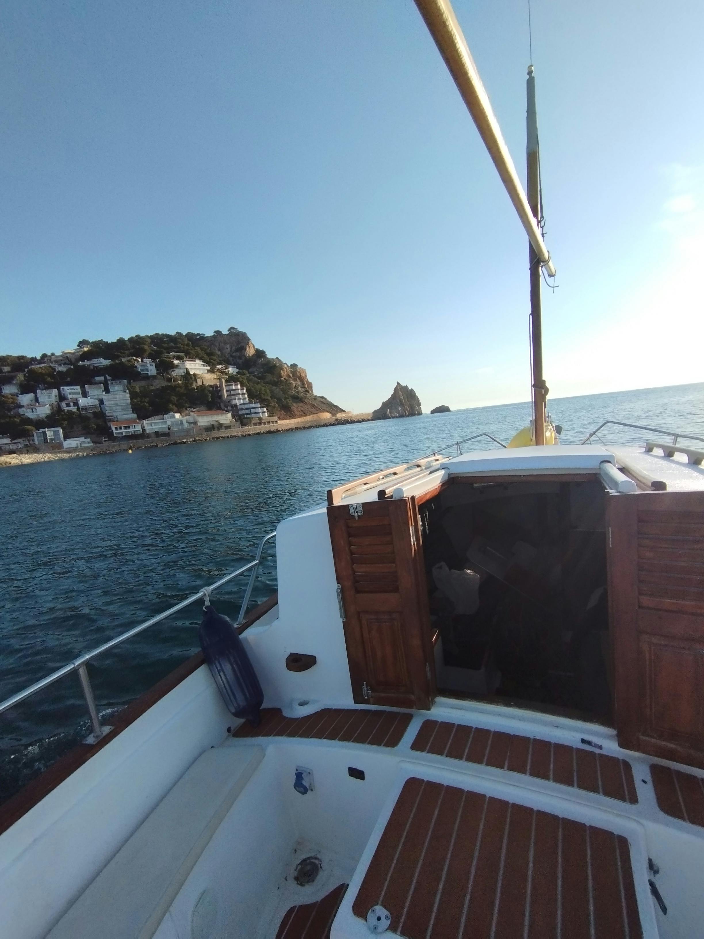 Onze traditionele mediterrane motorboot is perfect voor groepen tot vijf personen en biedt een ontspannen en intieme sfeer. Aan boord kun je genieten van een selectie van snacks, waaronder croissants en koffie, evenals snorkeluitrusting om de onderwaterwereld te verkennen. Deze 8-uur durende tocht is ontworpen om een balans te bieden van zon, wind, ontspanning en opwinding, wat zorgt voor gedenkwaardige momenten tijdens jouw dag op het water.